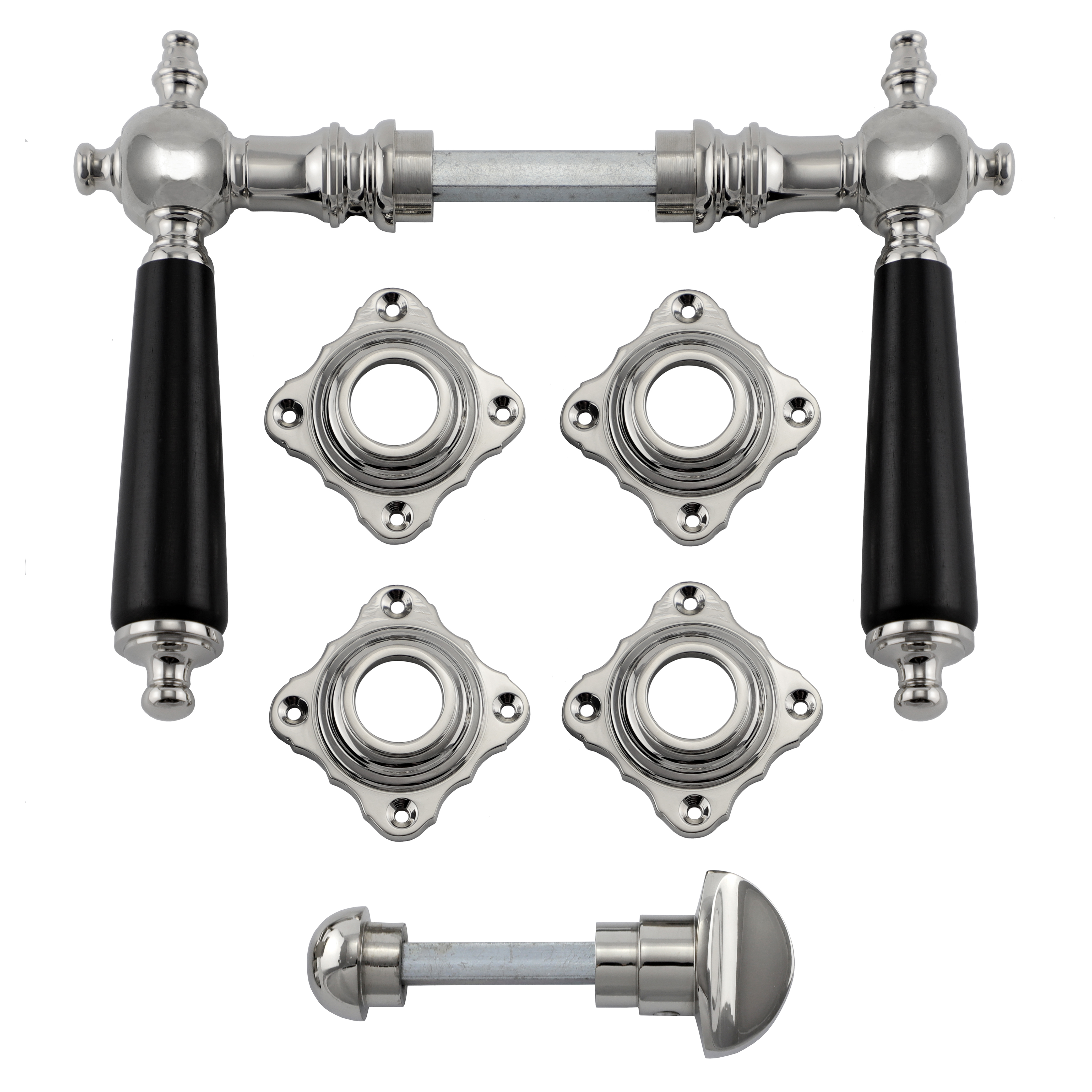 Vernickelter und polierter Türbeschlag aus Messing für Toilettentüren, mit schwarzen Ebenholzgriffen und Drehknauf. Es handelt sich bei diesem eleganten Türgriff um eine authentische Reproduktion nach historischem Vorbild.