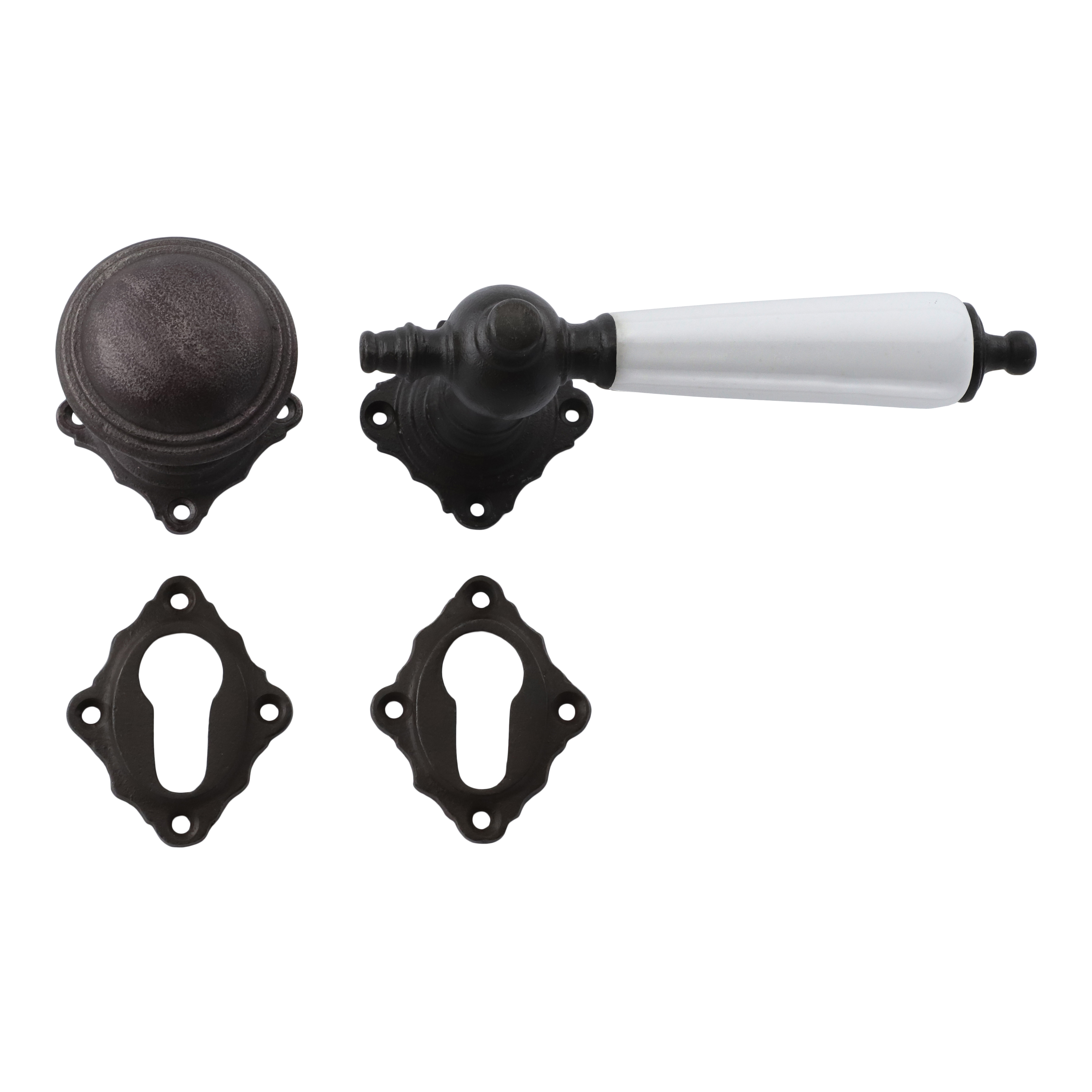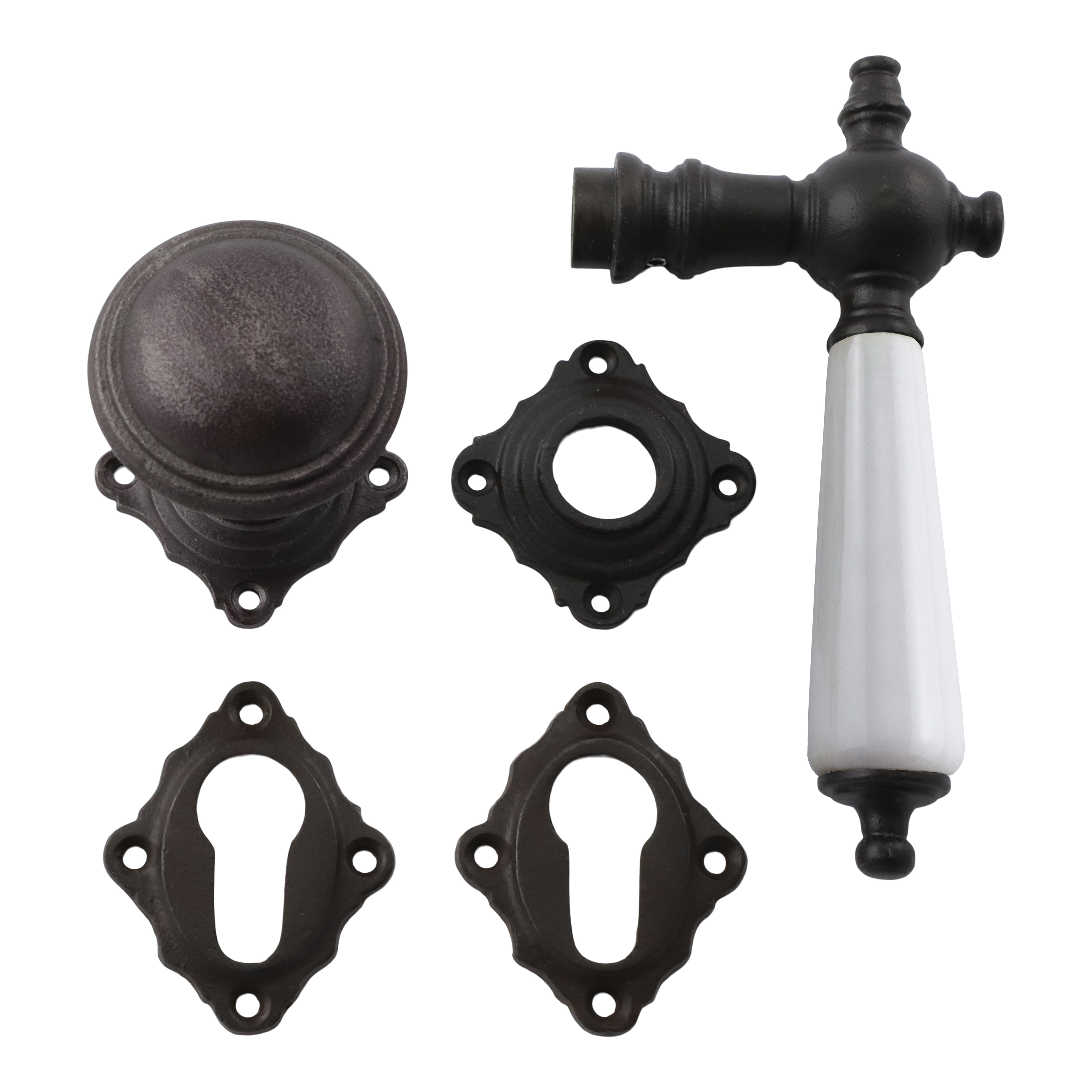 331.0010.60 Eingangstür-Garnitur Türgriffe mit Knauf Historismus-Stil Eisen antik Porzellan