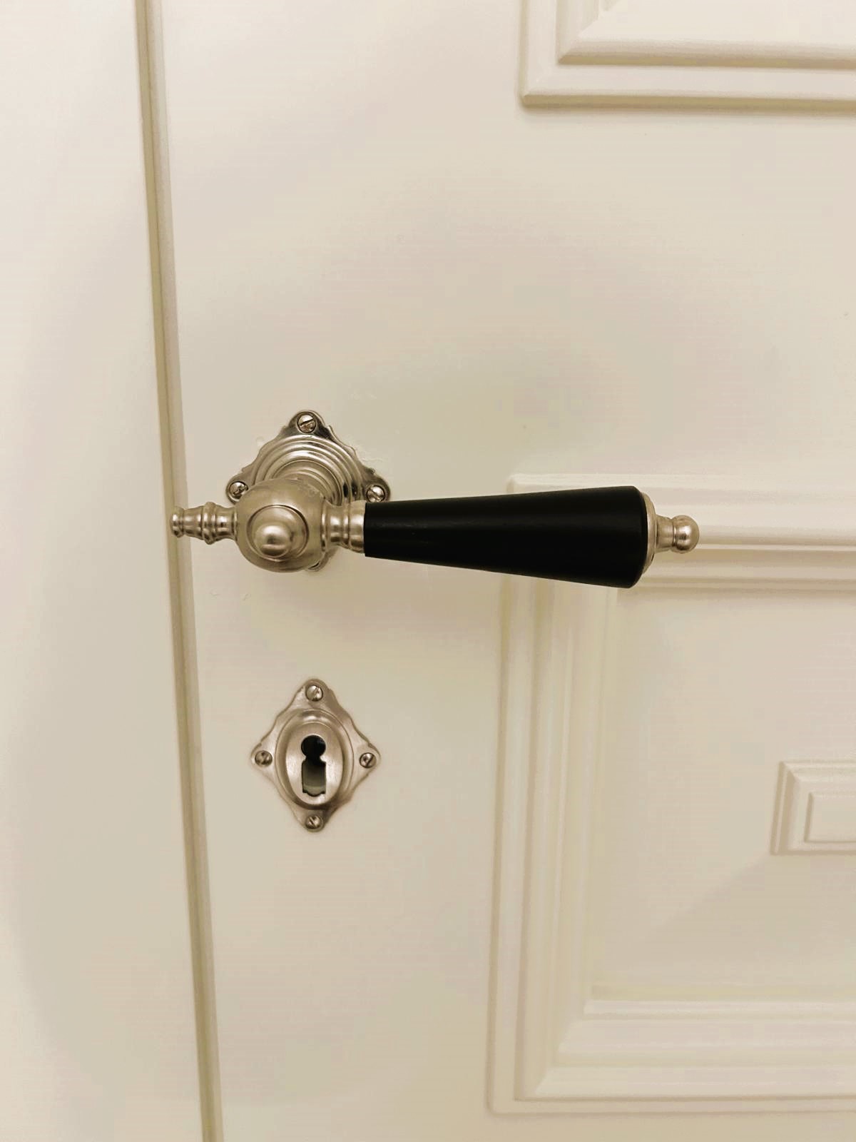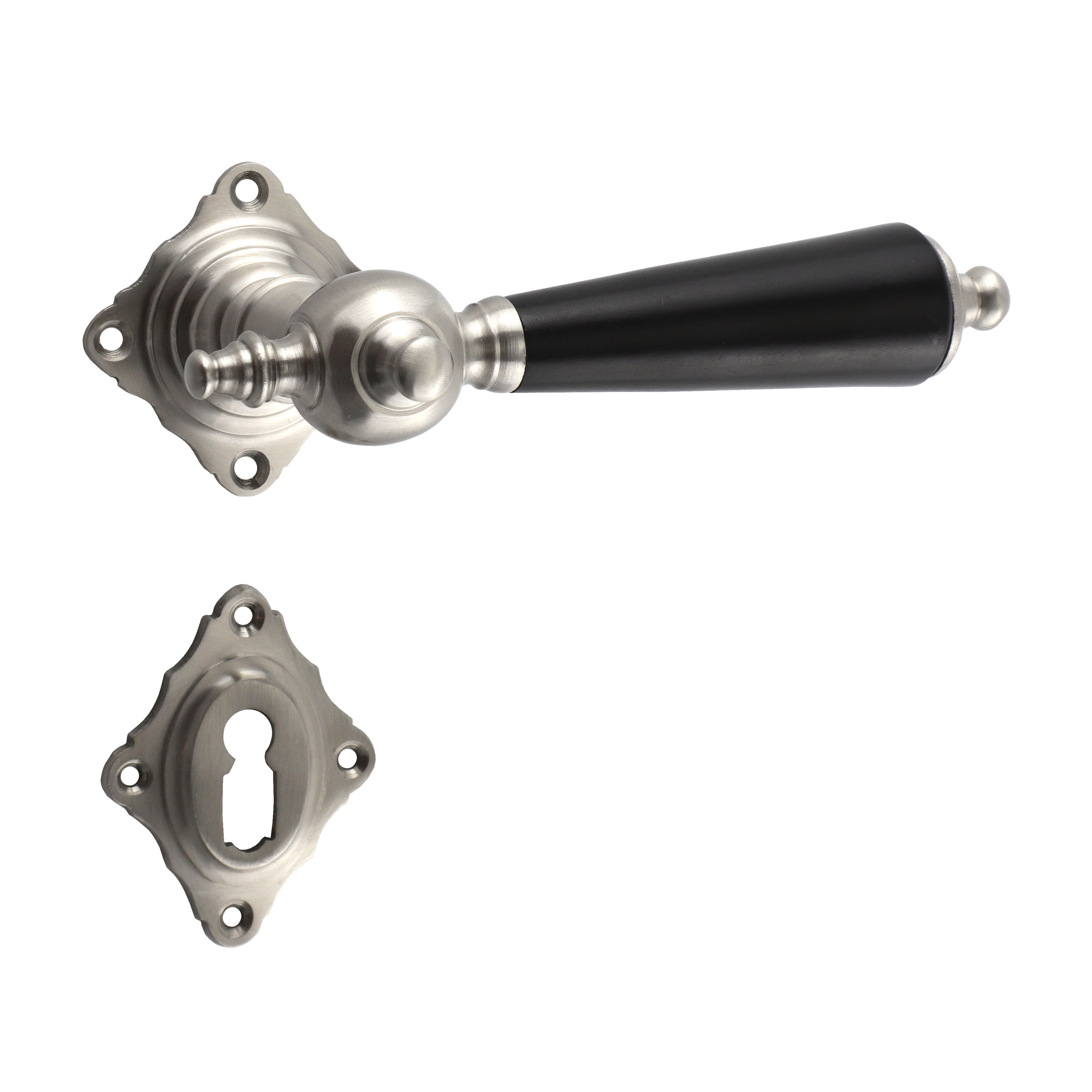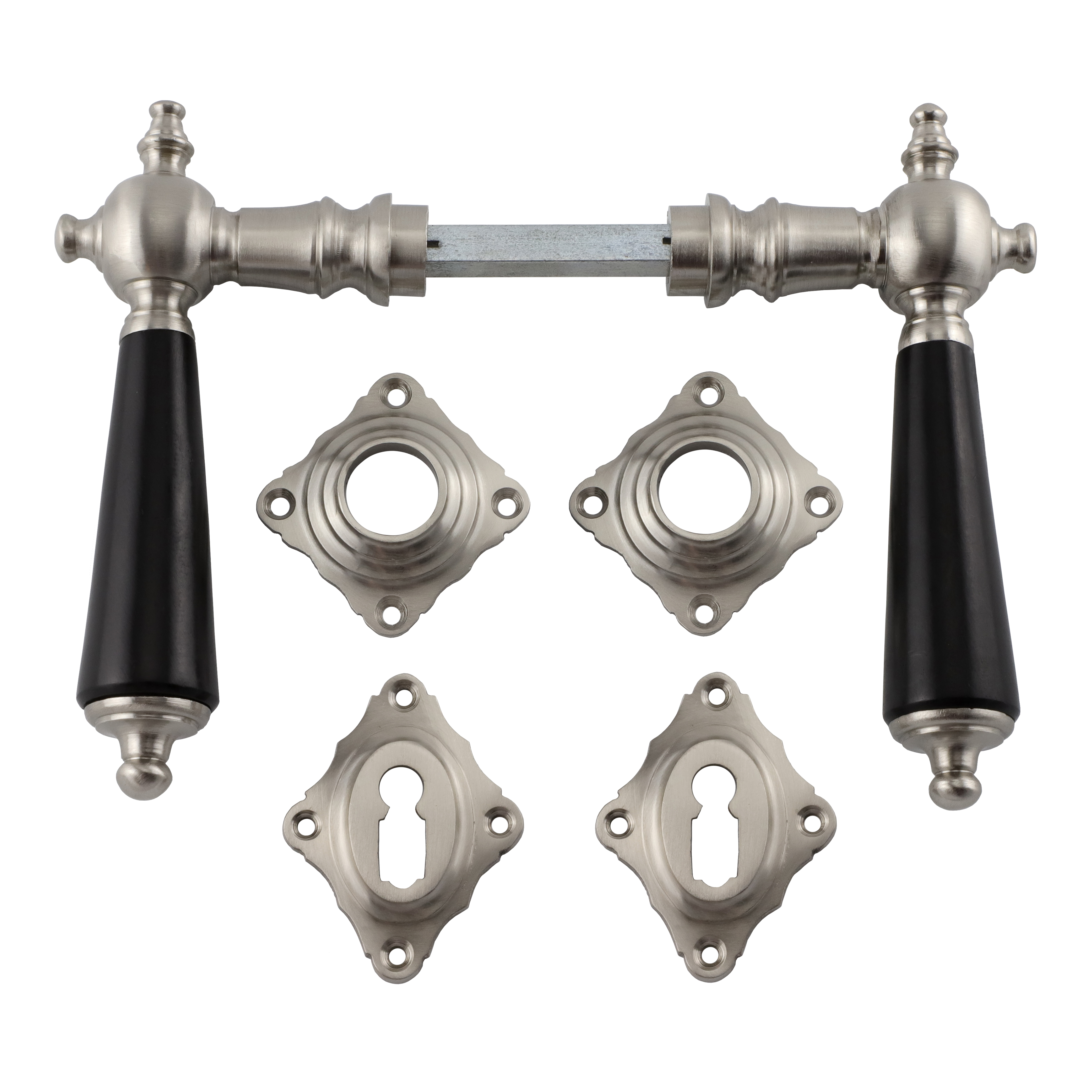 Vernickelter und matt gebürsteter Türbeschlag aus Messing für Zimmertüren, mit schwarzen Ebenholzgriffen und Buntbart-Rosetten. Es handelt sich bei diesem eleganten Türgriff um eine authentische Reproduktion nach historischem Vorbild.