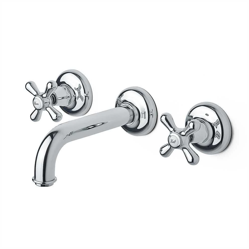 Zwei Unterputzventile (Kalt- und Warmregelung) machen aus diesem Wandauslauf eine Dreilocharmatur fürs Waschbecken.