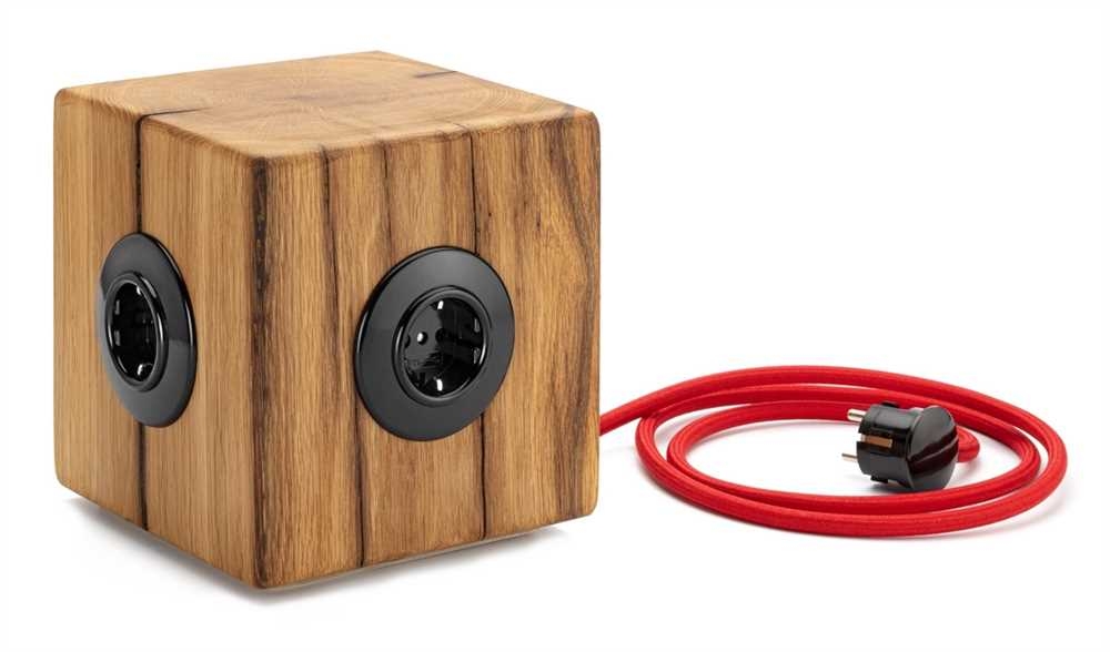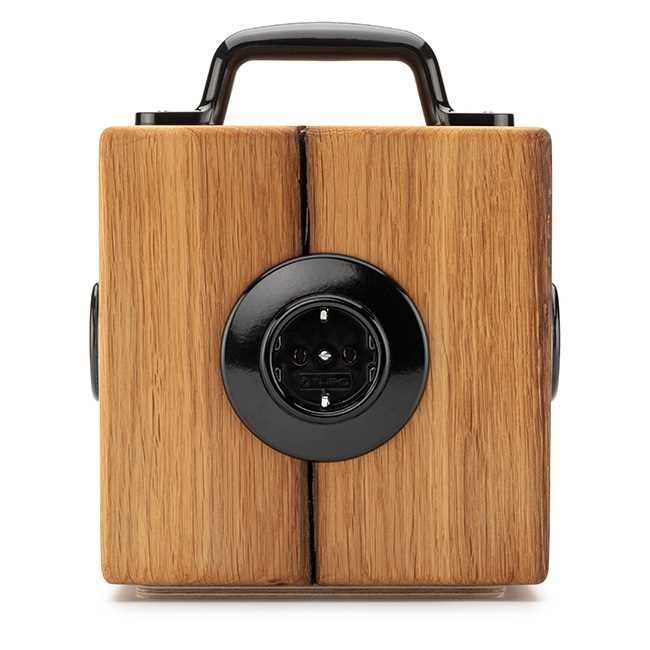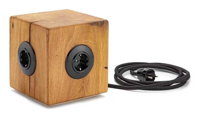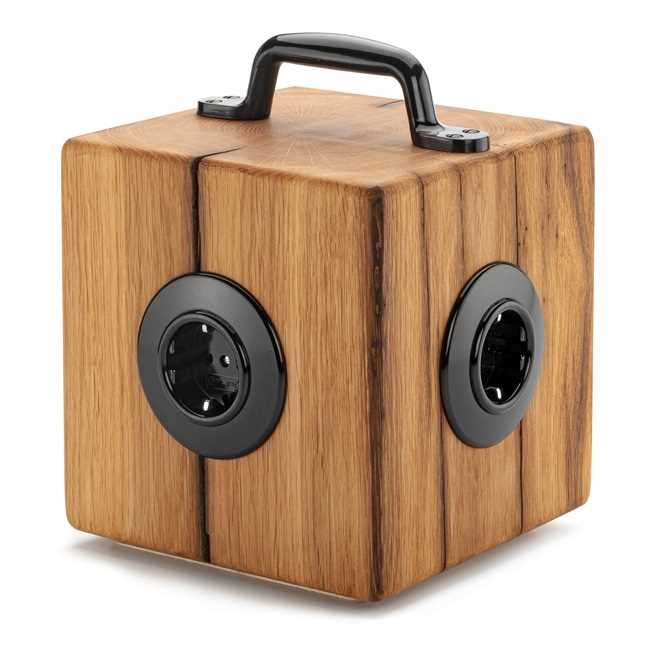 17 x 17 x 17 cm groß und 2,8 Kilo schwer, ausgestattet mit drei Bakelitsteckdosen und einer roten Zuleitung aus Voka-Textilkabeln mit einem Winkelstecker. Das schwere Stück richtet sich in jeder denkbaren Wohn- und Büroumgebung ein und bereichert sie mit Stromquellen und seiner Ansehnlichkeit.