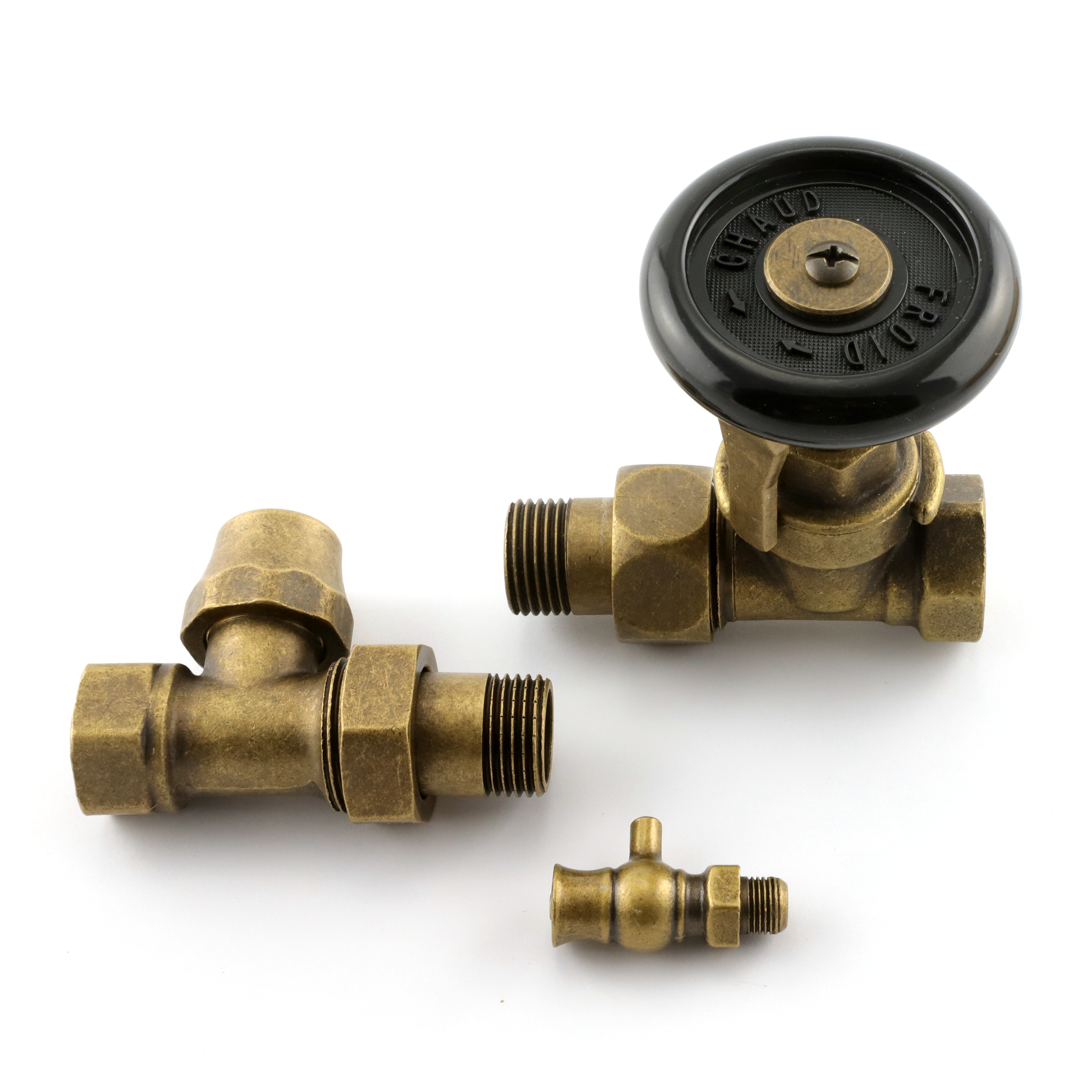 Temperaturregulationsventil aus Messing mit schwarzem Regulationsknauf für nostalgische Radiatoren.