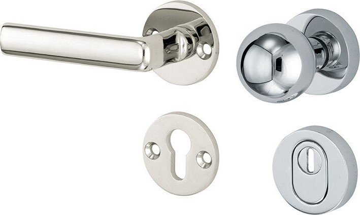 Eigenschaften "311.0035.13 Eingangstür Rosetten Garnitur Knauf/Klinke mit Kernziehschutz Messing vernickelt/verchromt Glanz DIN Links"