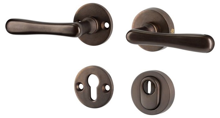311.0040.50 Eingangstür Rosetten Garnitur Klinke/Klinke mit Kernziehschutz Messing Bronze antik, DIN links