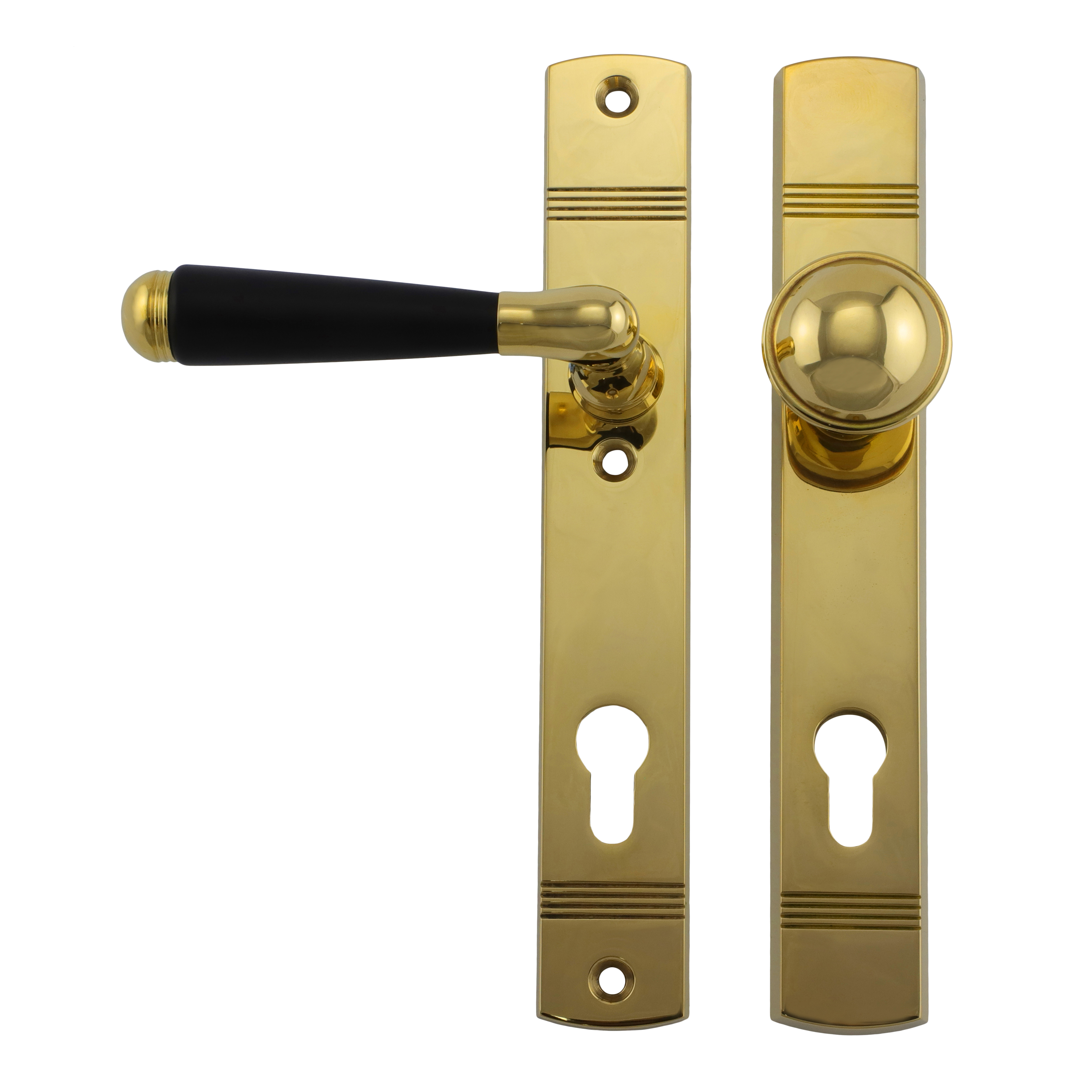312.0023.35 Haustür-Garnitur mit Türgriff und Knauf Jugendstil Messing poliert PZ 92 mm