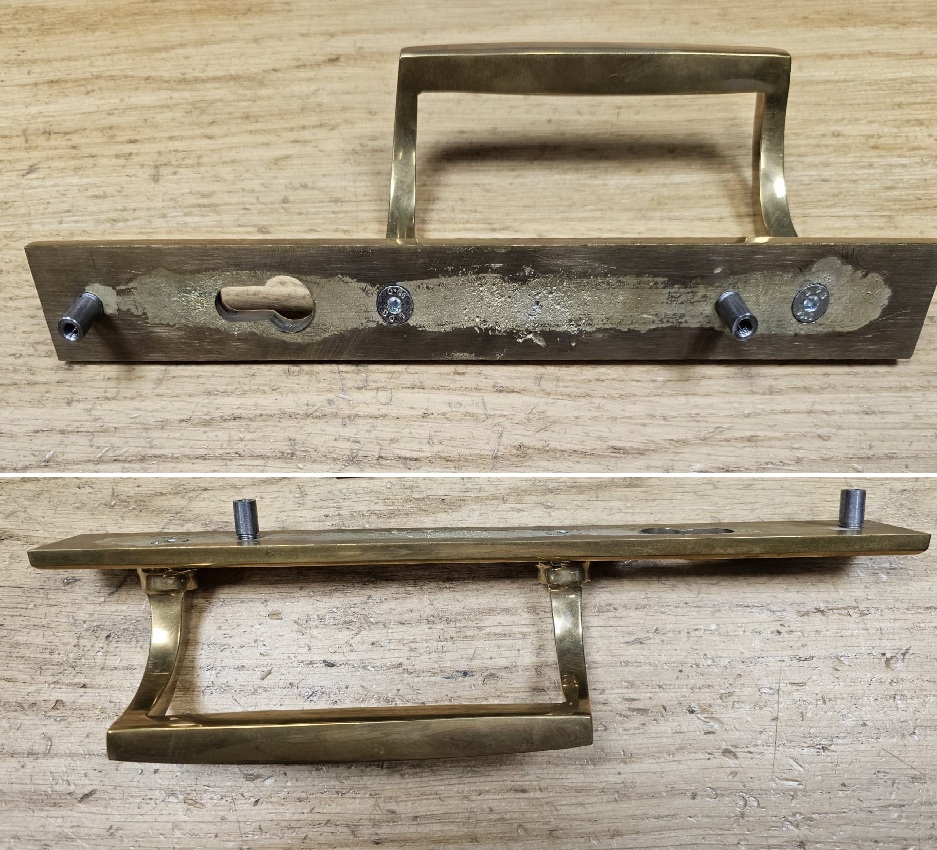 Eigenschaften "312.0043.45 Haustür-Garnitur Türgriffe mit Ziehgriff Messing patiniert Jugendstil DIN rechts"