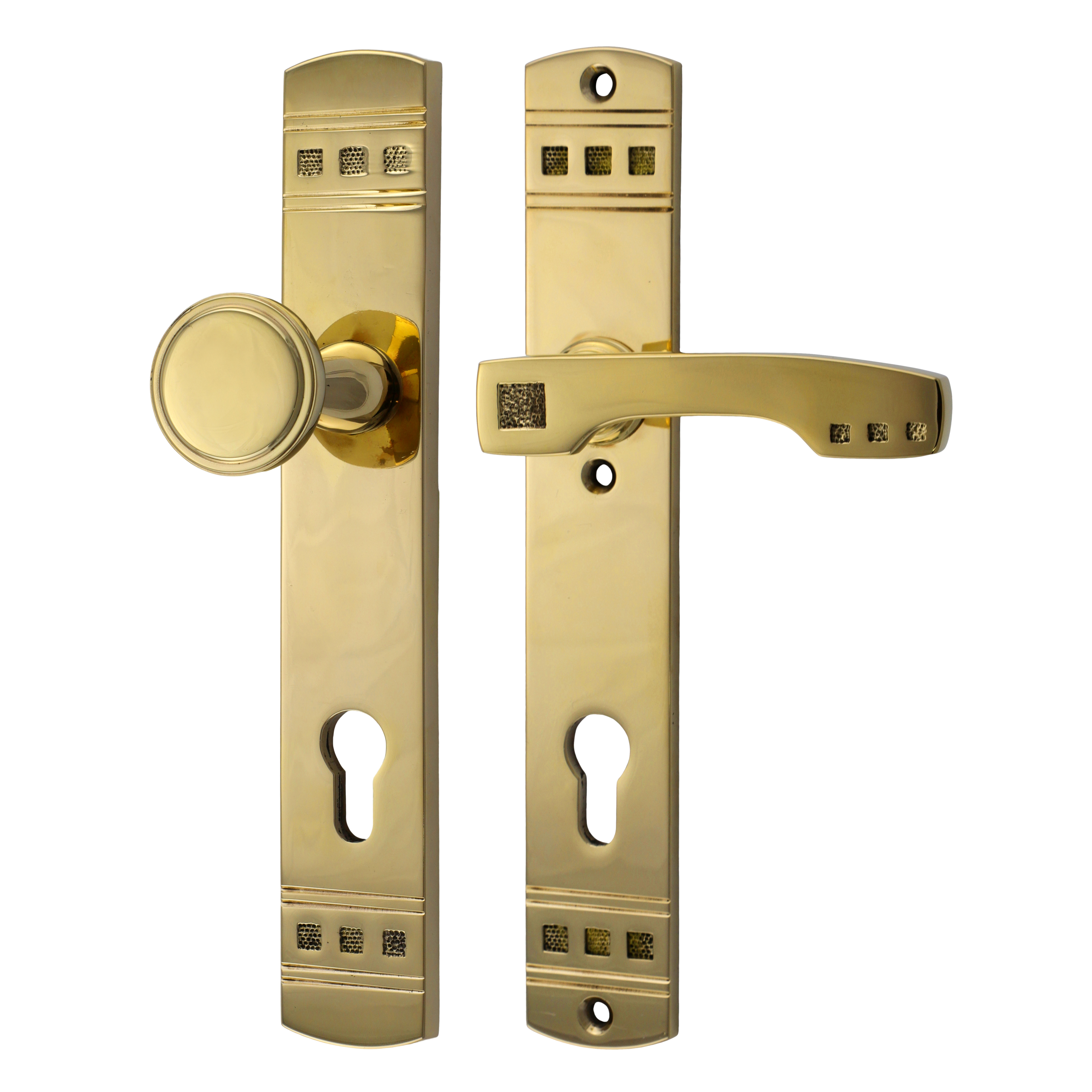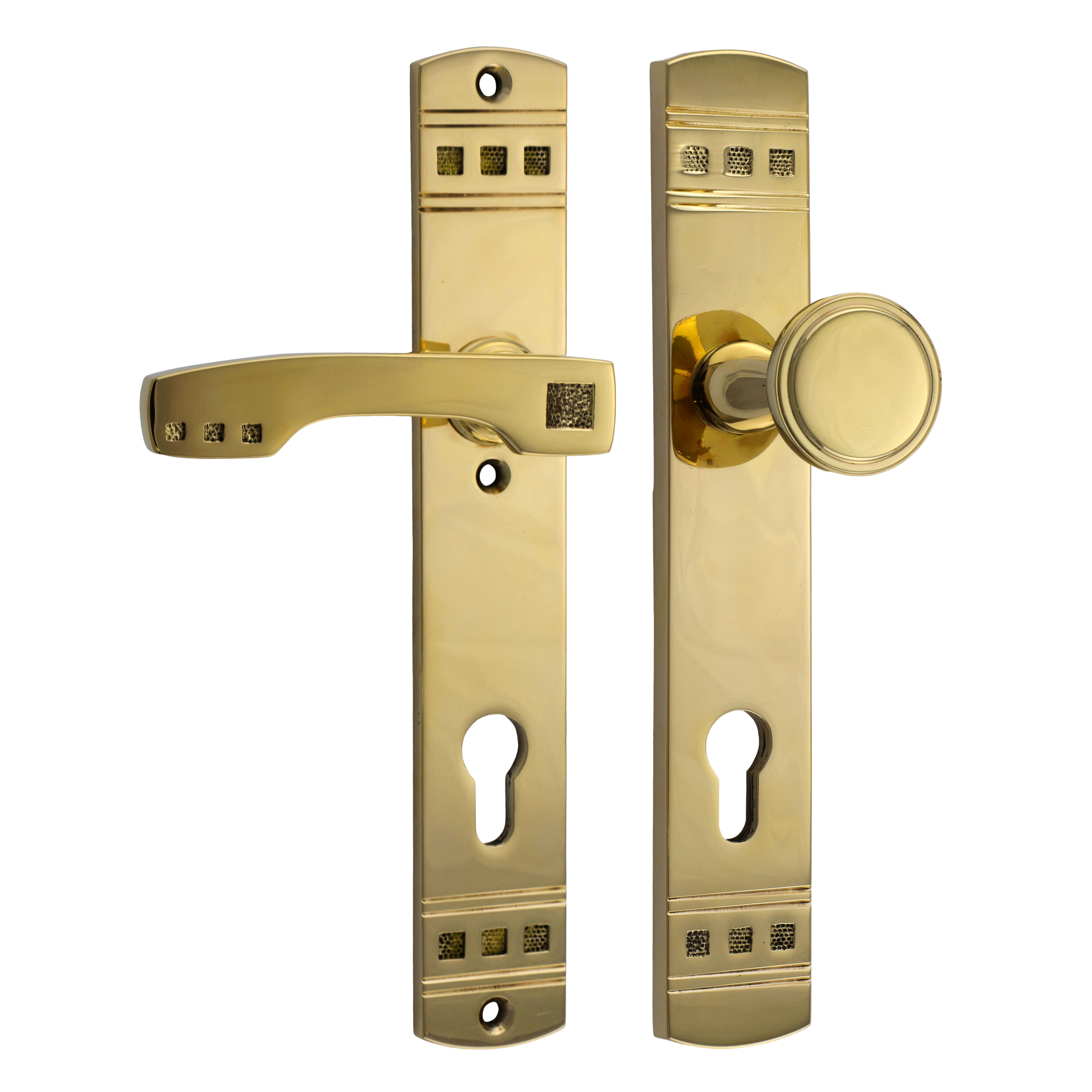 Eigenschaften "312.0123.35 Haustür-Garnitur Türgriffe mit Knauf Messing poliert Jugendstil DIN links"