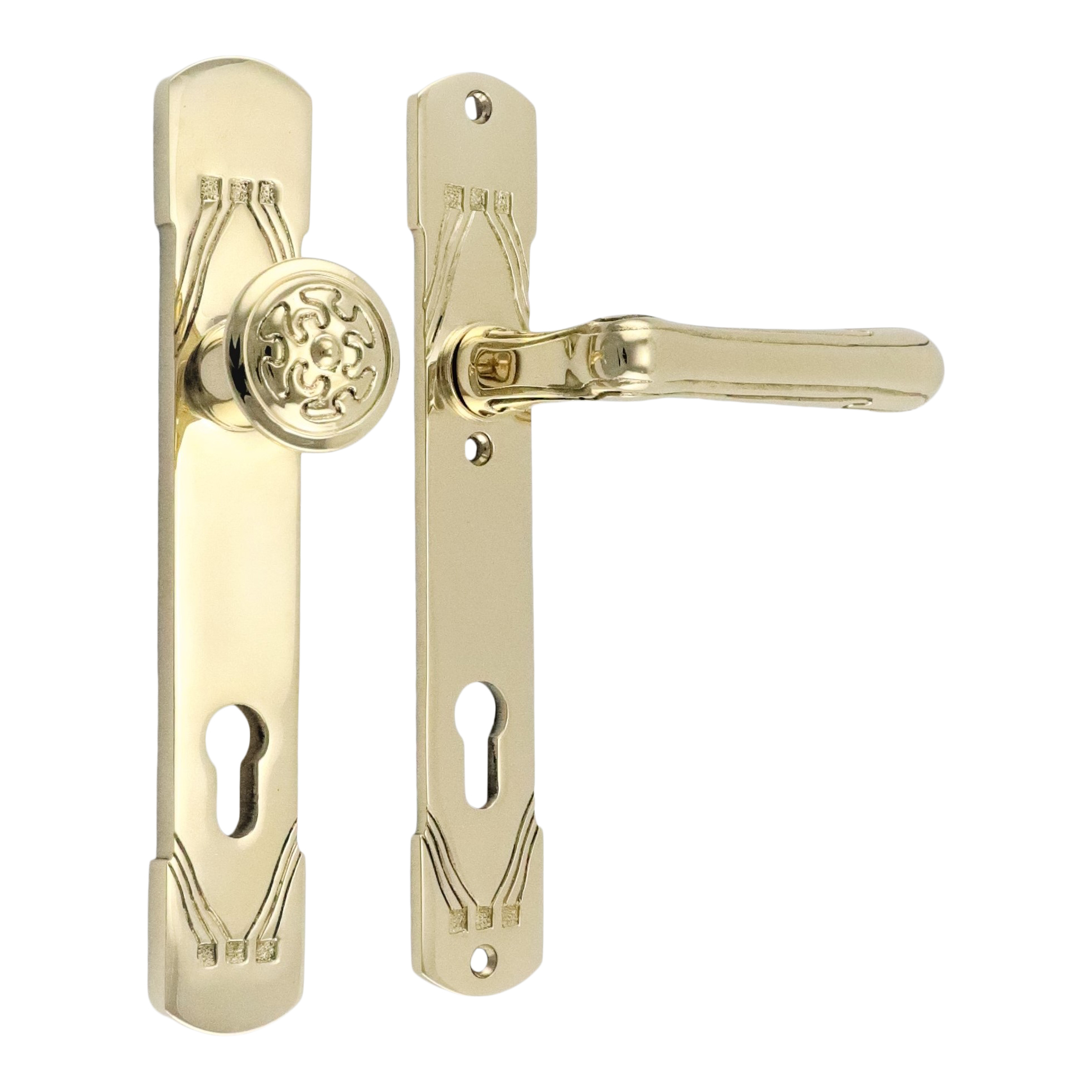312.0135.35 Haustür-Garnitur Türgriffe mit Knauf Messing poliert Jugendstil DIN rechts