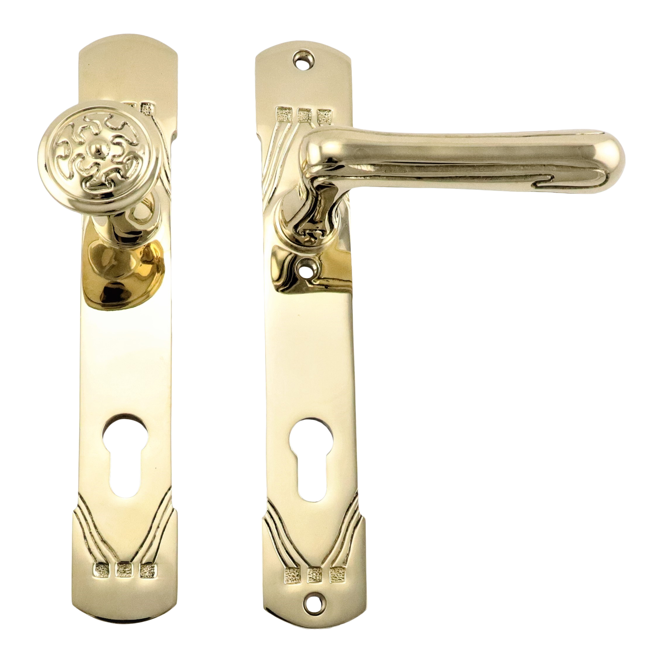 Eigenschaften "312.0135.35 Haustür-Garnitur Türgriffe mit Knauf Messing poliert Jugendstil DIN rechts"