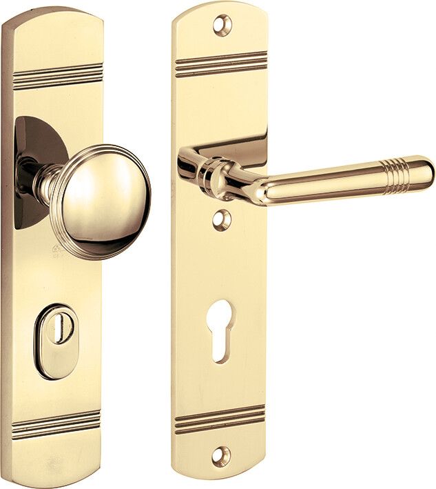 Eigenschaften "312.0138.36 Haustür Langschildgarnitur im Jugendstil Knauf/Klinke mit Kernziehschutz Messing poliert PVD DIN rechts, PZ 92 mm "