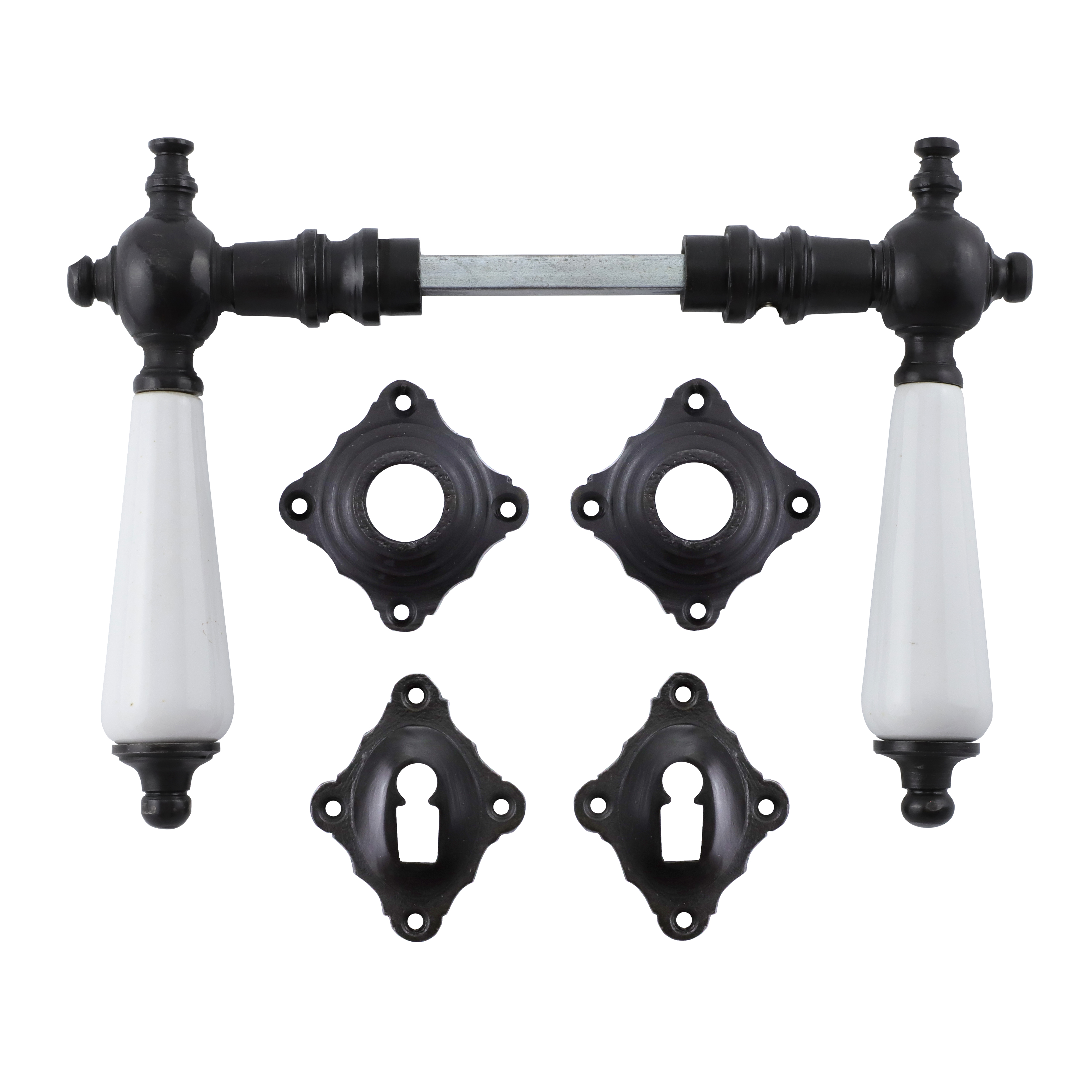 Pulverbeschichteter Türbeschlag aus Eisen für Zimmertüren, mit weißen Porzellangriffen und Buntbart-Rosetten. Es handelt sich bei diesem rustikalen Türgriff um eine authentische Reproduktion nach historischem Vorbild.