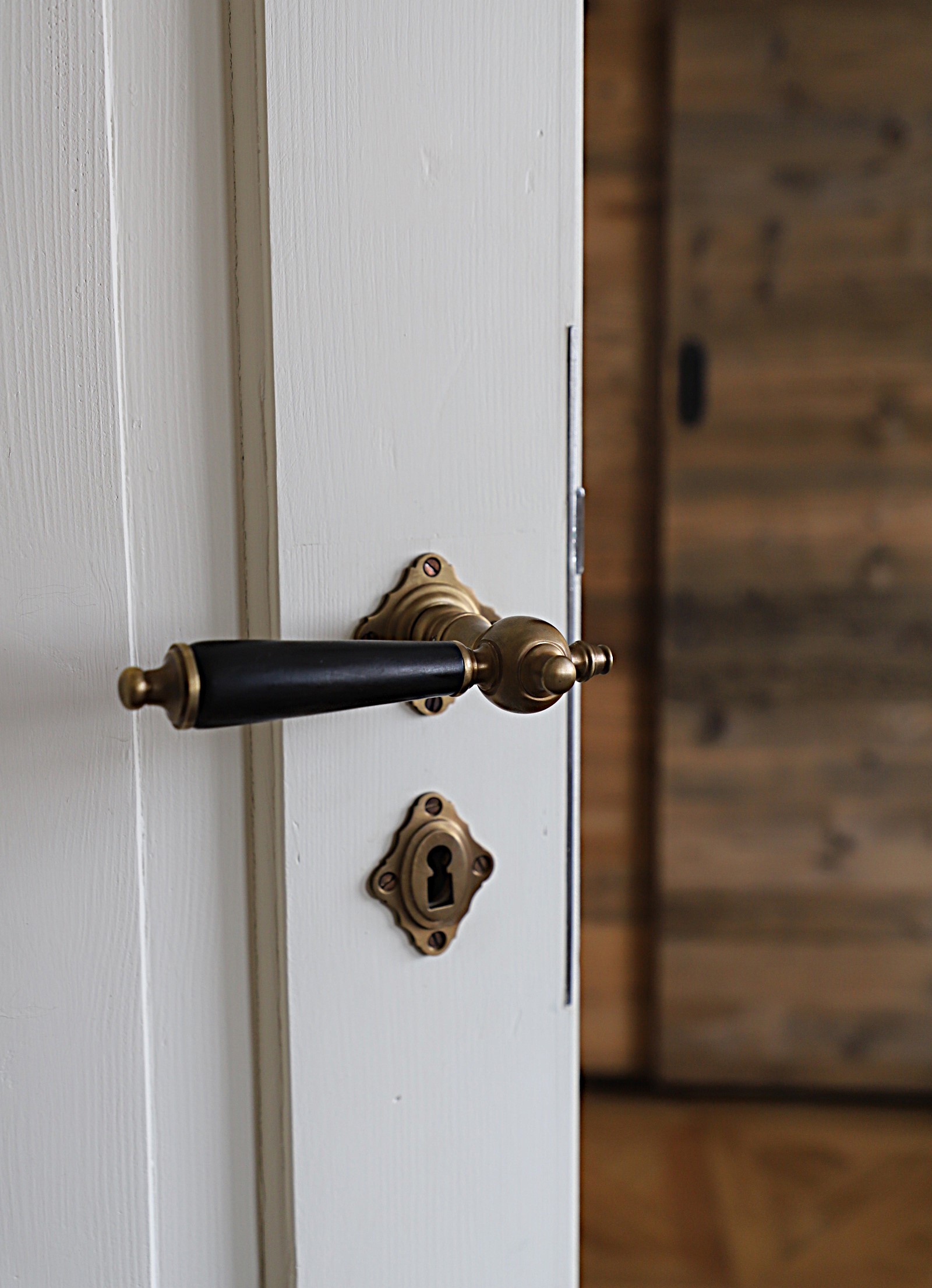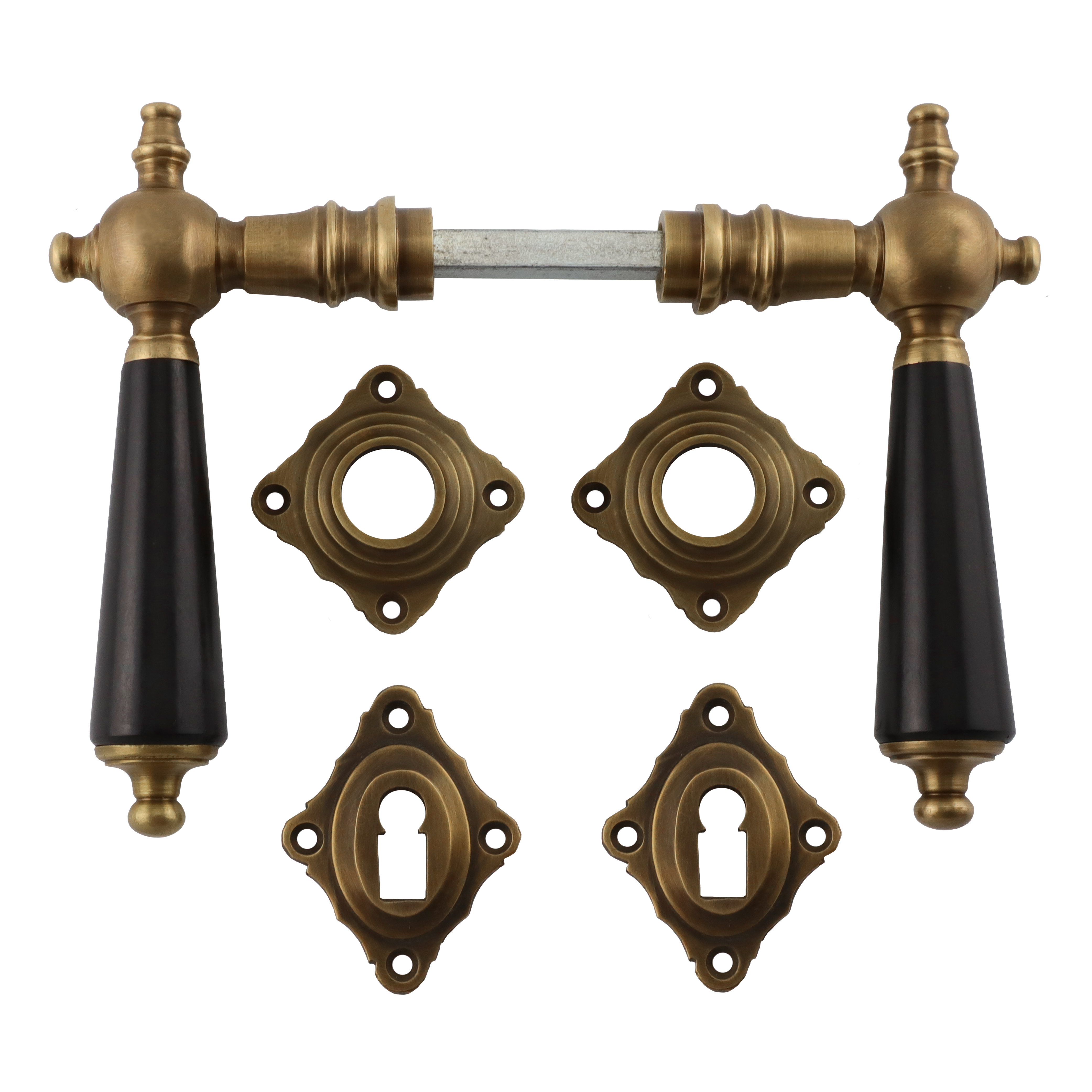 Patinierter Türbeschlag aus Messing für Zimmertüren, mit schwarzen Ebenholzgriffen und Buntbart-Rosetten. Es handelt sich bei diesem eleganten Türgriff um eine authentische Reproduktion nach historischem Vorbild.