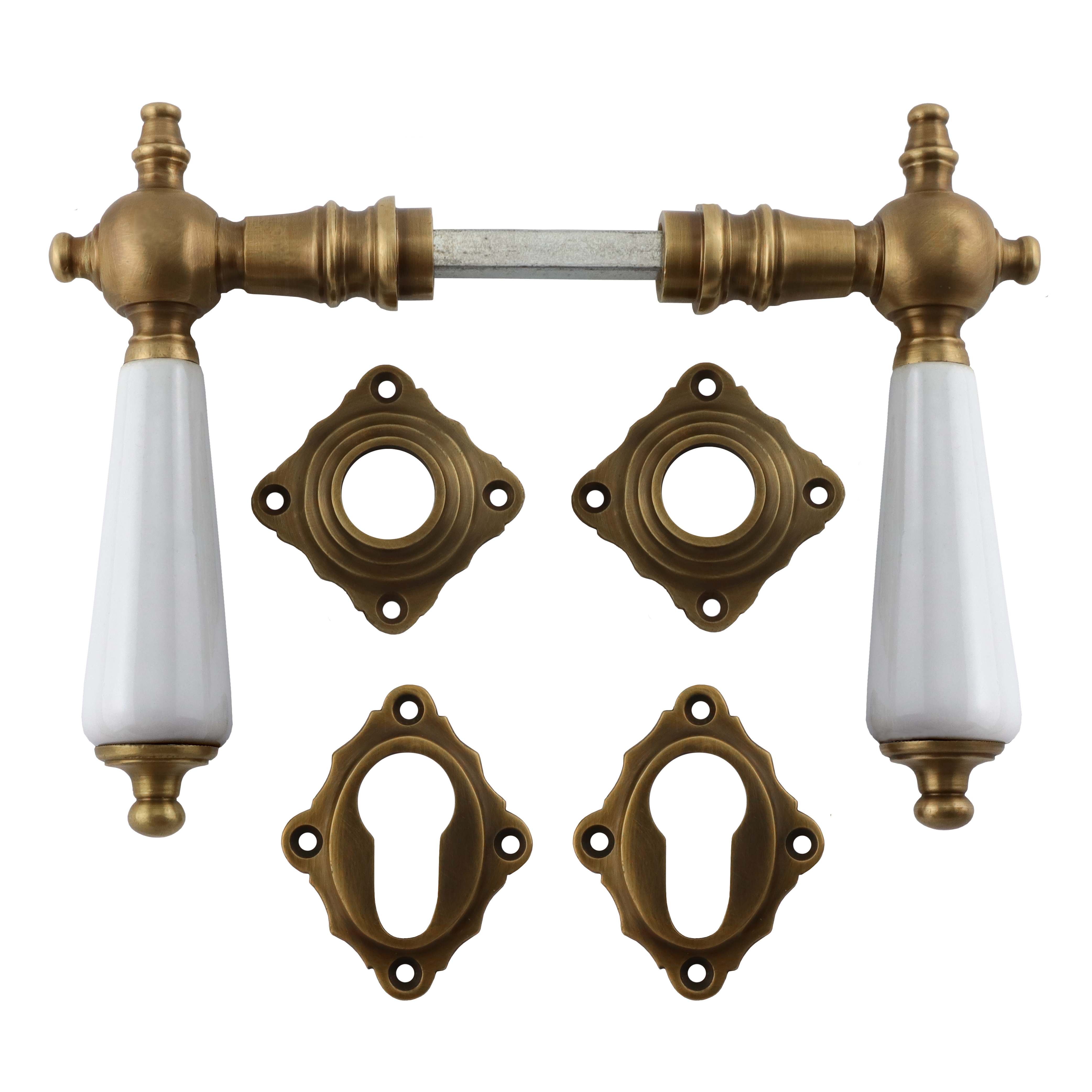 Patinierter Türbeschlag aus Messing für Zimmertüren, mit weißen Porzellangriffen und PZ-Rosetten. Es handelt sich bei diesem eleganten Türgriff um eine authentische Reproduktion nach historischem Vorbild.
