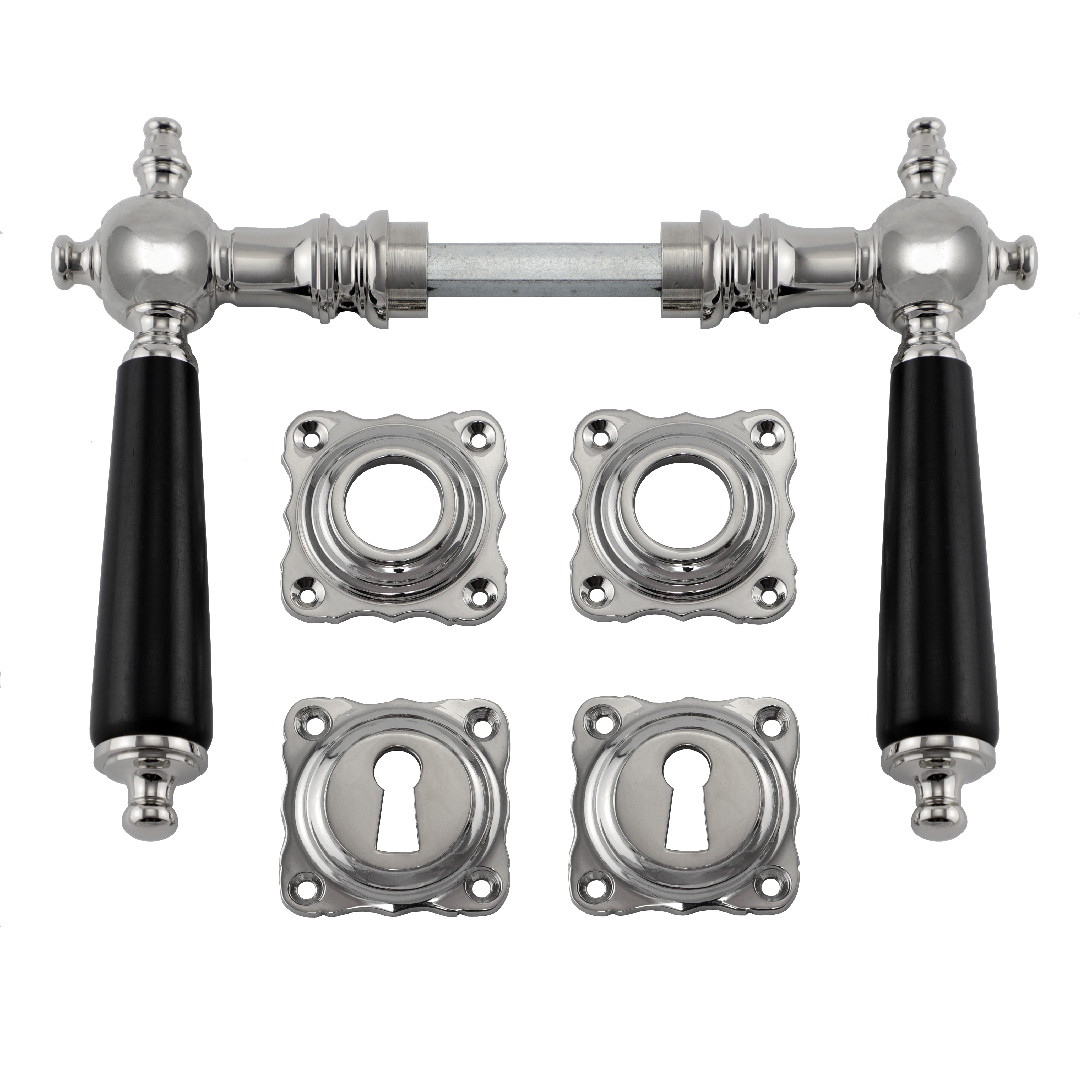 Eigenschaften "321.0030.10 Türgriffe mit Rosetten Messing vernickelt Ebenholz Historismus"