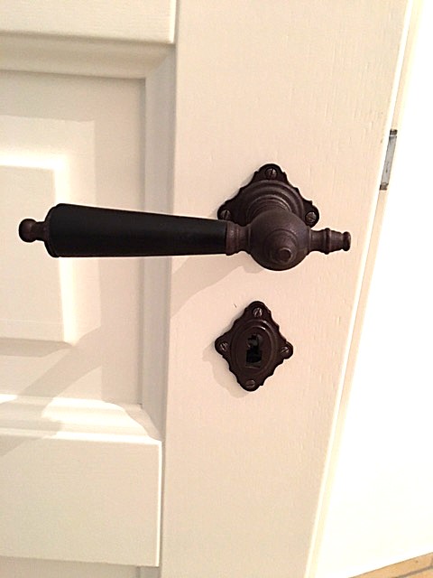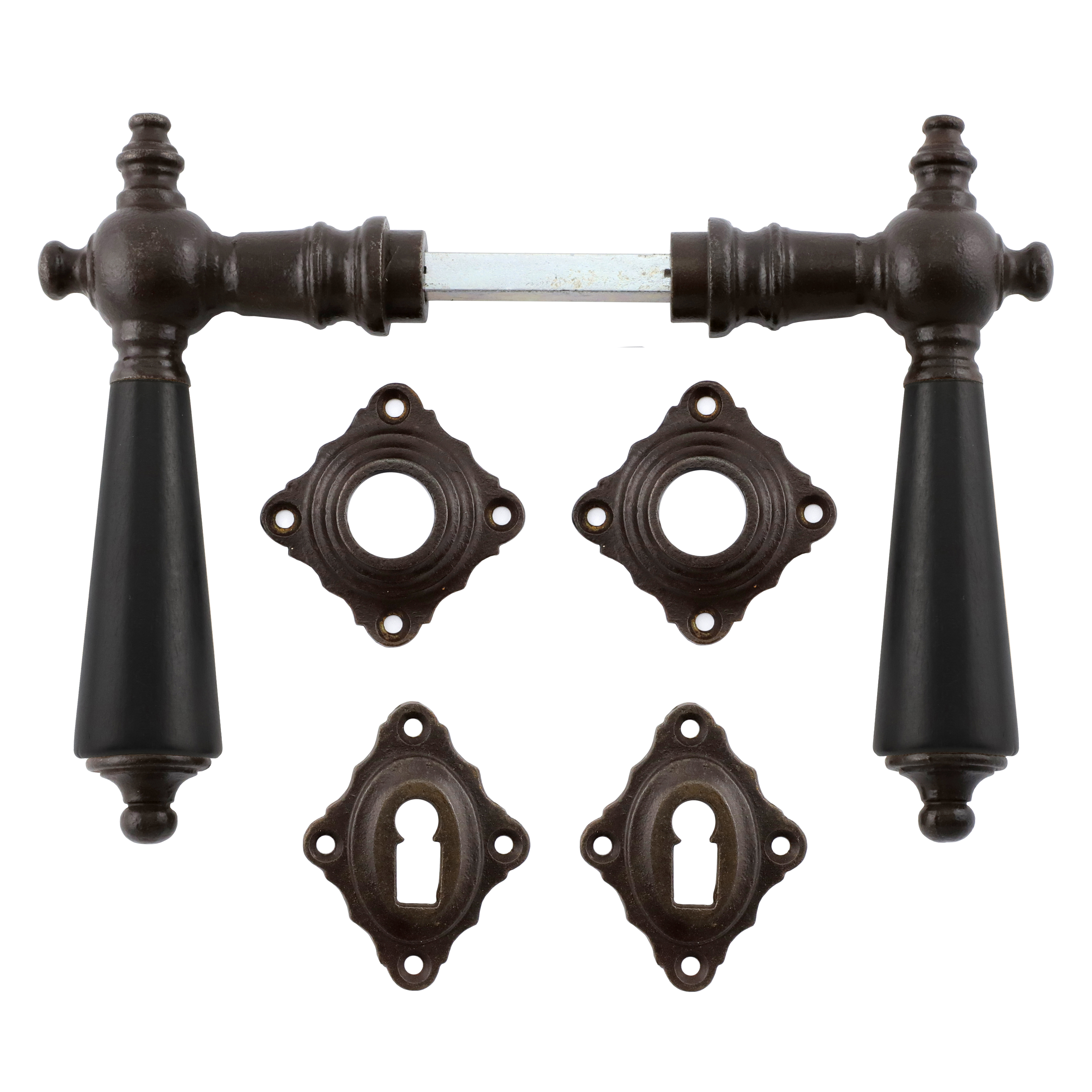 Antikisierter Türbeschlag aus Eisen für Zimmertüren, mit schwarzen Ebenholzgriffen und Buntbart-Rosetten. Es handelt sich bei diesem rustikalen Türgriff um eine authentische Reproduktion nach historischem Vorbild.