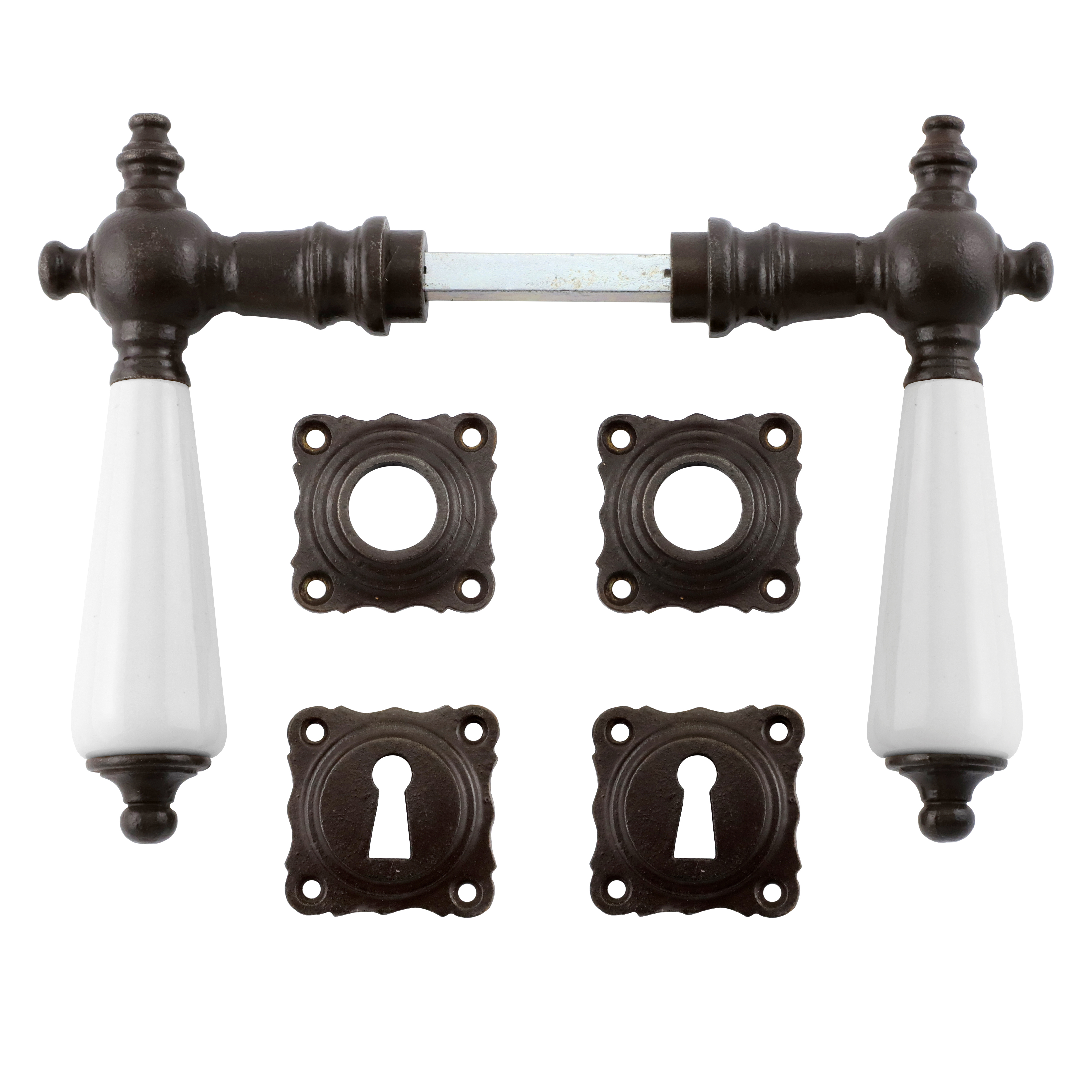 Antikisierter Türbeschlag aus Eisen für Zimmertüren, mit weißen Porzellangriffen und Buntbart-Rosetten. Es handelt sich bei diesem rustikalen Türgriff um eine authentische Reproduktion nach historischem Vorbild.