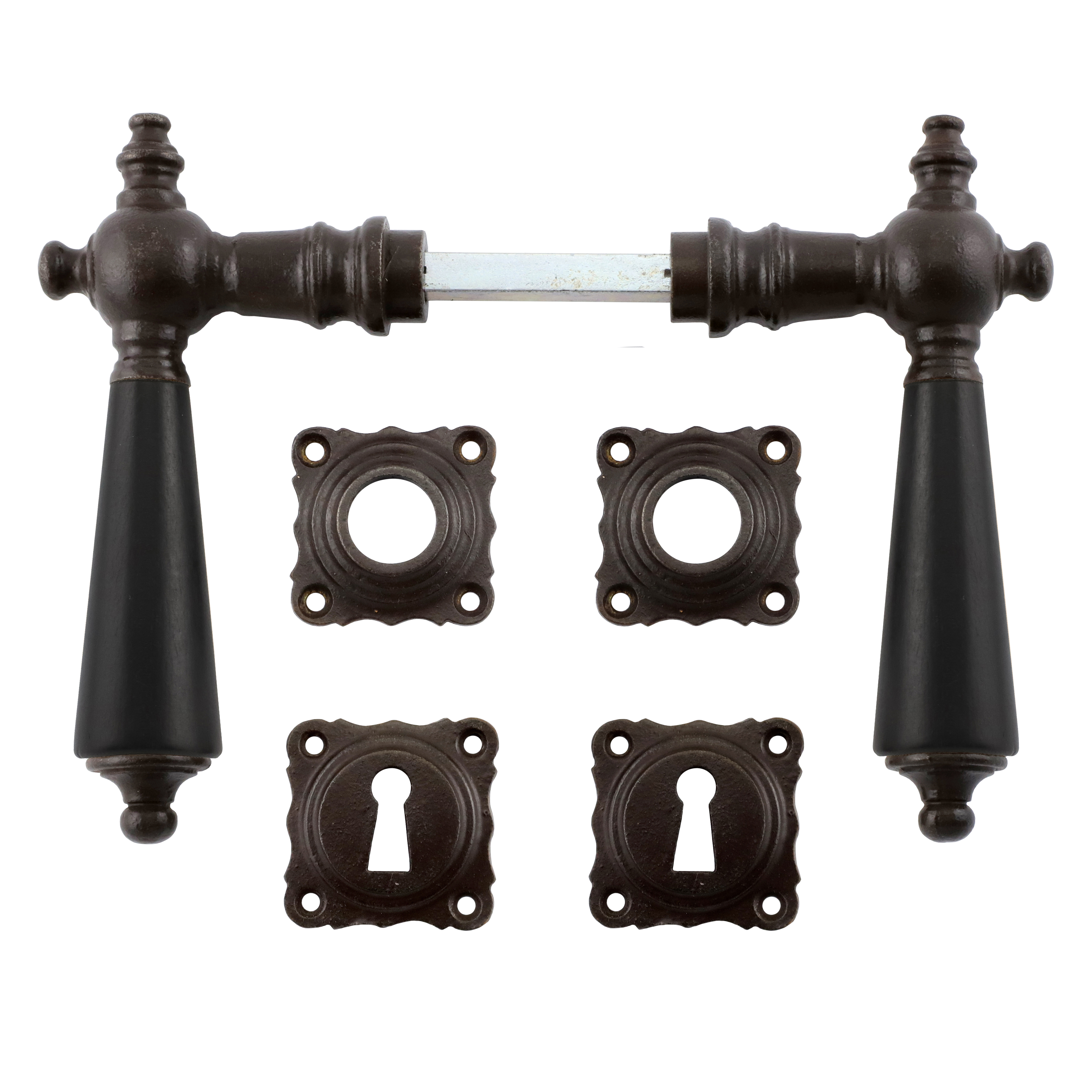 Antikisierter Türbeschlag aus Eisen für Zimmertüren, mit schwarzen Ebenholzgriffen und Buntbart-Rosetten. Es handelt sich bei diesem rustikalen Türgriff um eine authentische Reproduktion nach historischem Vorbild.