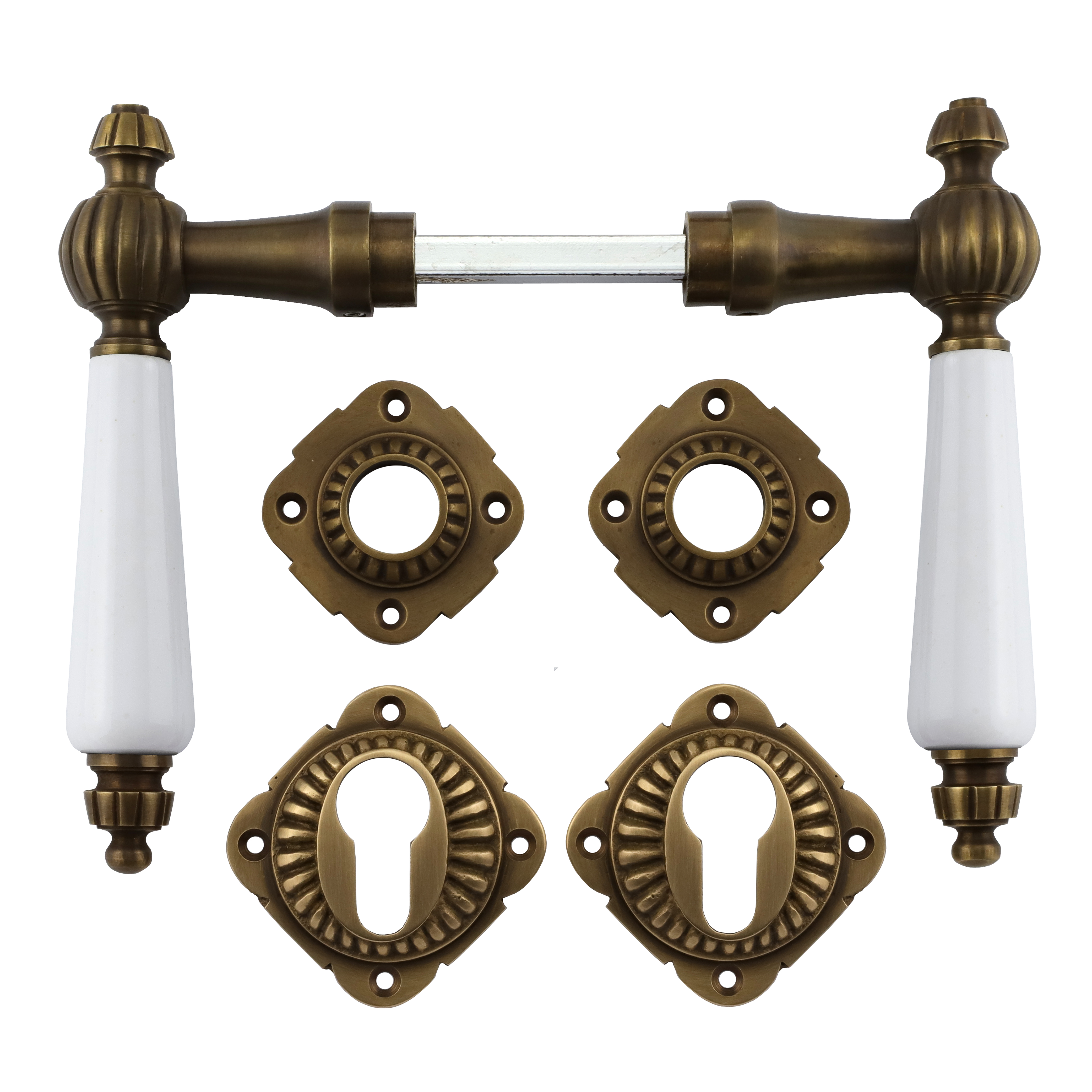 Patinierter Türbeschlag aus Messing für Zimmertüren, mit weißen Porzellangriffen und PZ-Rosetten. Es handelt sich bei diesem eleganten Türgriff um eine authentische Reproduktion nach historischem Vorbild.