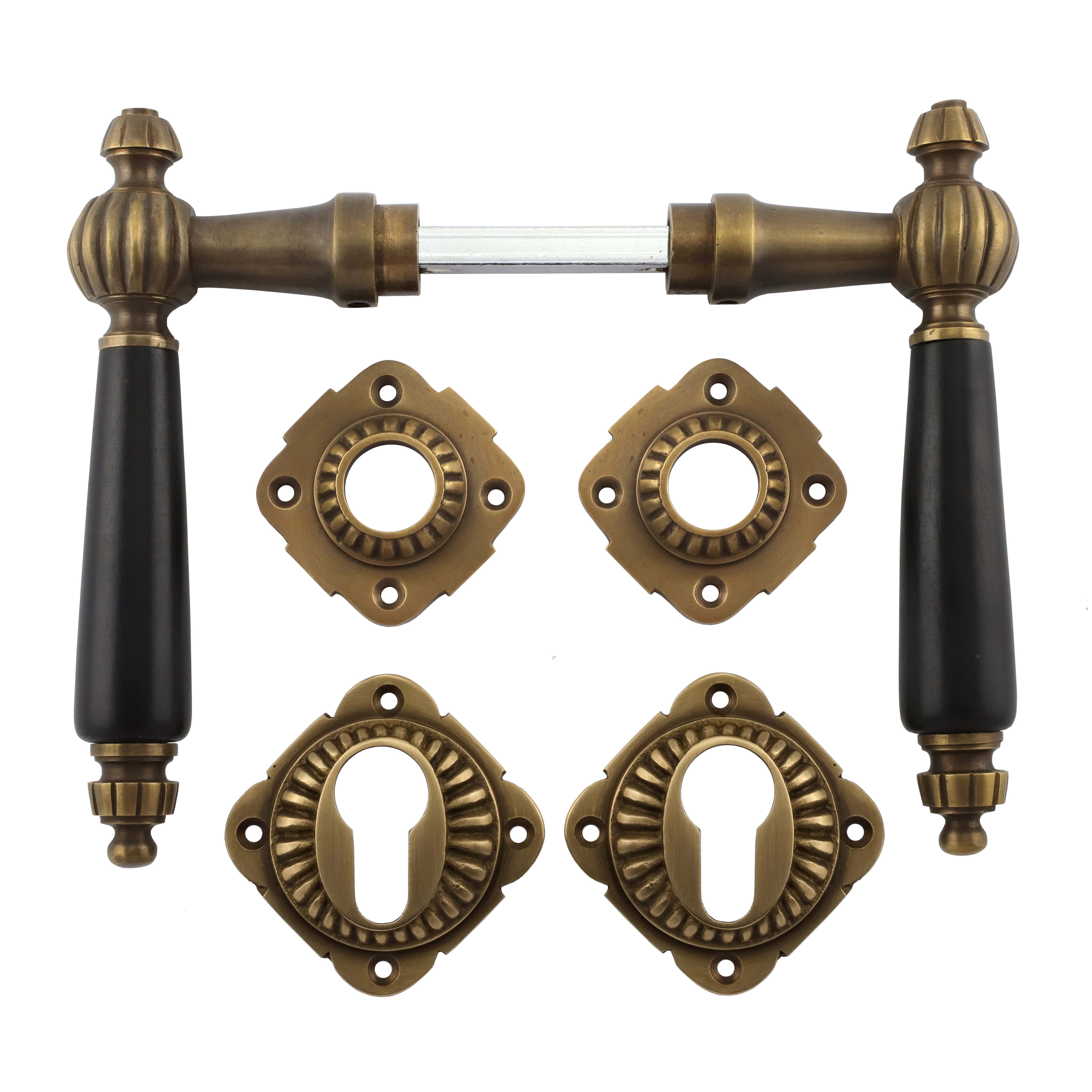 Patinierter Türbeschlag aus Messing für Zimmertüren, mit schwarzen Ebenholzgriffen und PZ-Rosetten. Es handelt sich bei diesem eleganten Türgriff um eine authentische Reproduktion nach historischem Vorbild.