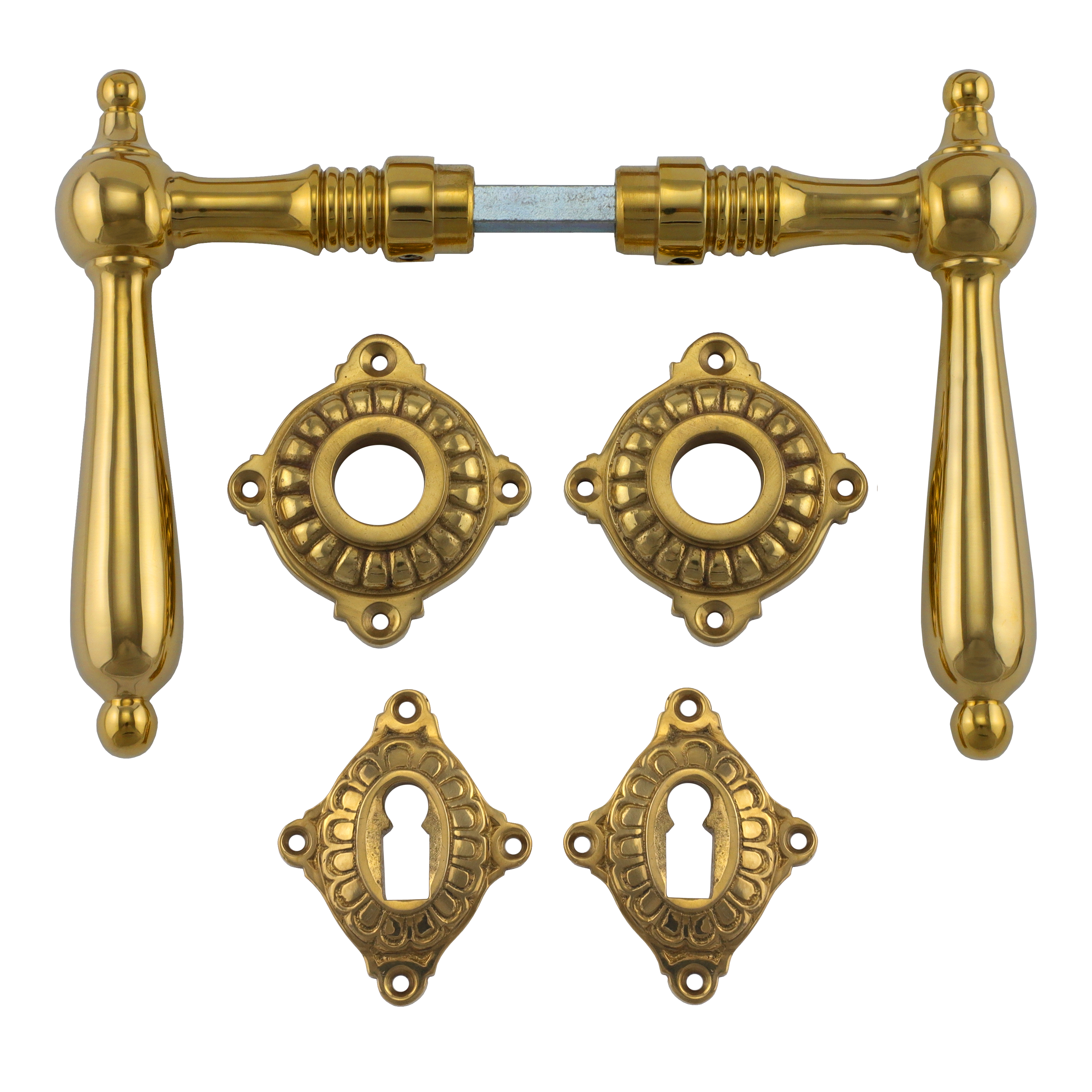 Polierter Türbeschlag aus Messing für Zimmertüren, mit massiven Griffen und Buntbart-Rosetten. Es handelt sich bei diesem eleganten Türgriff um eine authentische Reproduktion nach historischem Vorbild.