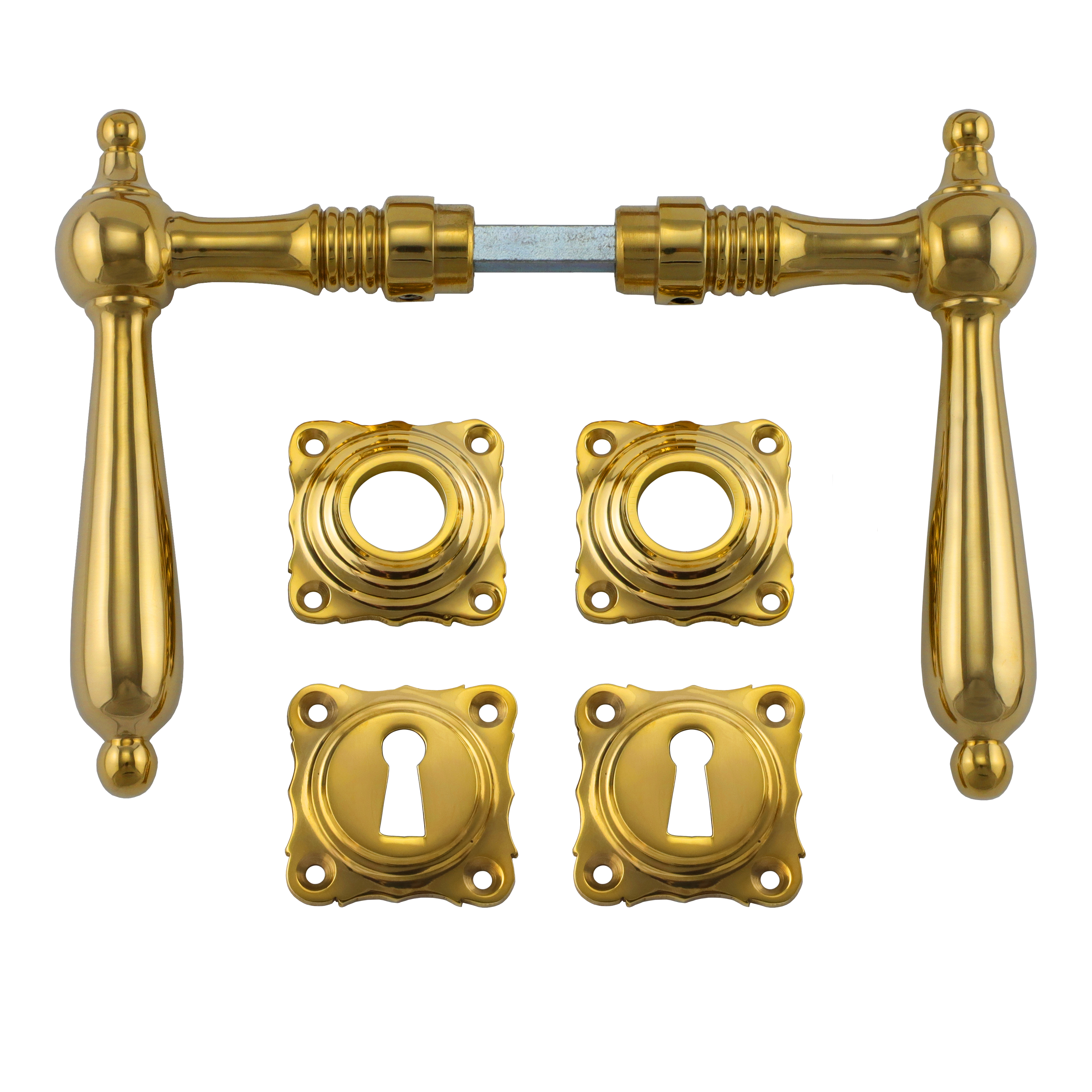 Polierter Türbeschlag aus Messing für Zimmertüren, mit massiven Griffen und Buntbart-Rosetten. Es handelt sich bei diesem eleganten Türgriff um eine authentische Reproduktion nach historischem Vorbild.