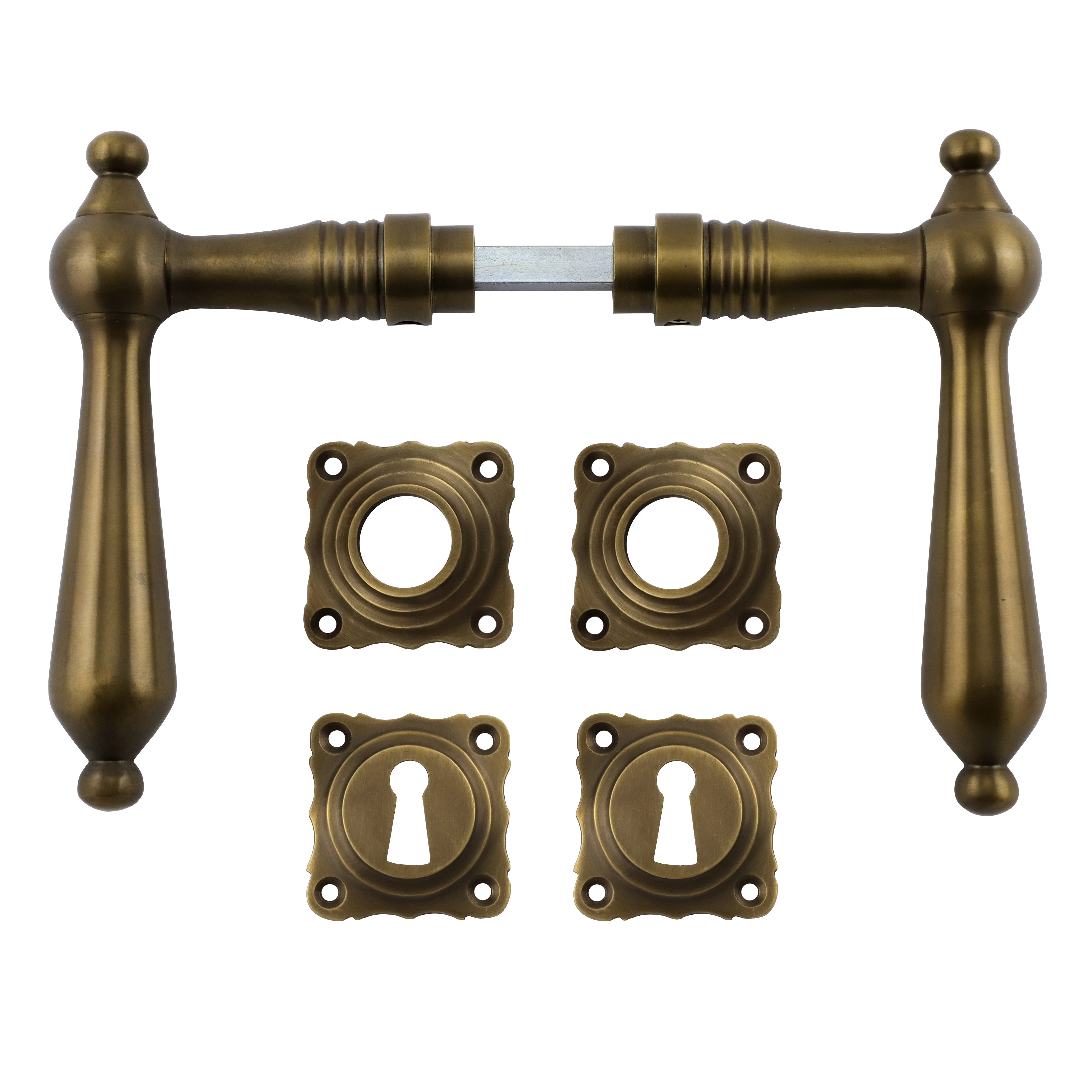 Patinierter Türbeschlag aus Messing für Zimmertüren, mit massiven Griffen und Buntbart-Rosetten. Es handelt sich bei diesem eleganten Türgriff um eine authentische Reproduktion nach historischem Vorbild.
