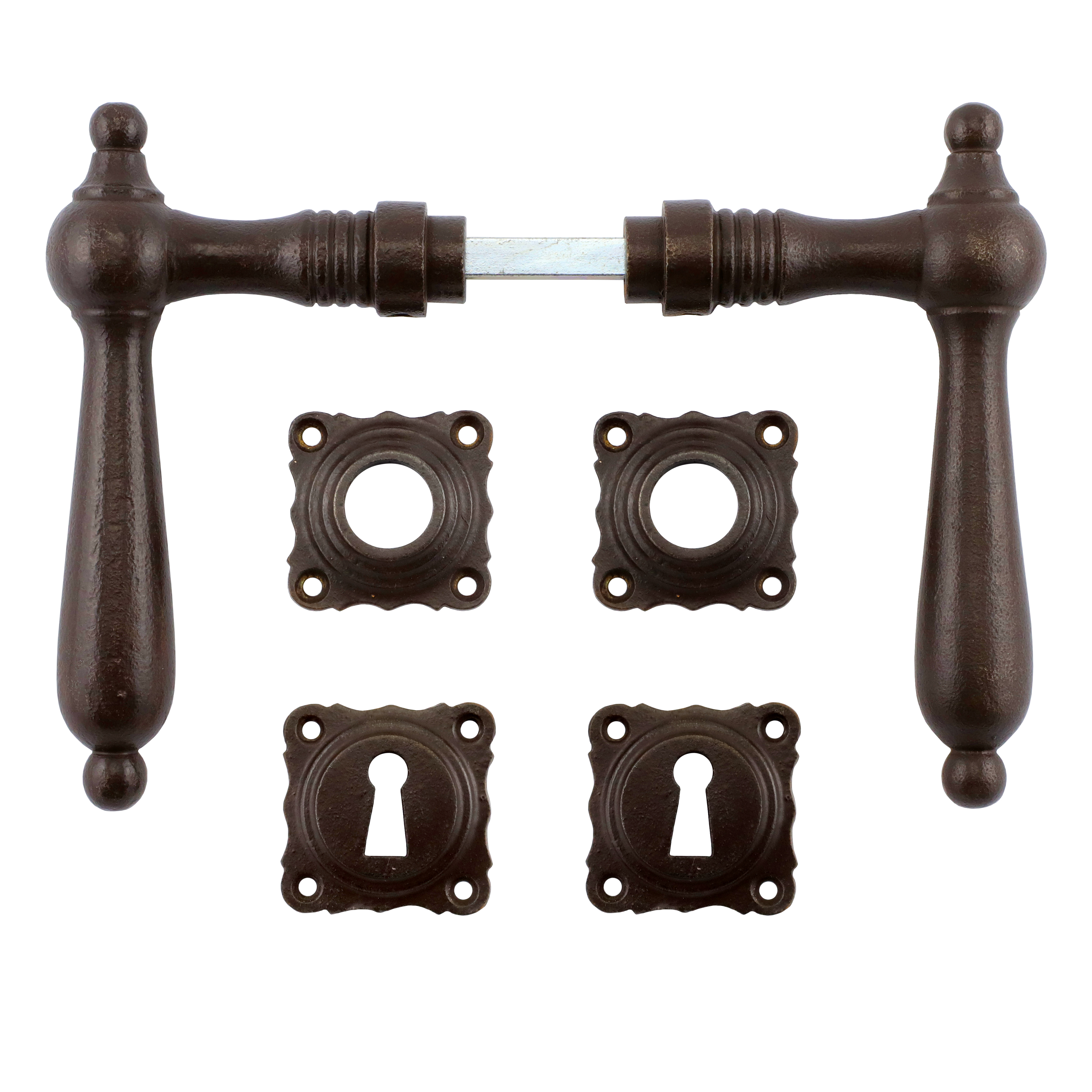 Antikisierter Türbeschlag aus Eisen für Zimmertüren, mit massiven Griffen und Buntbart-Rosetten. Es handelt sich bei diesem rustikalen Türgriff um eine authentische Reproduktion nach historischem Vorbild.