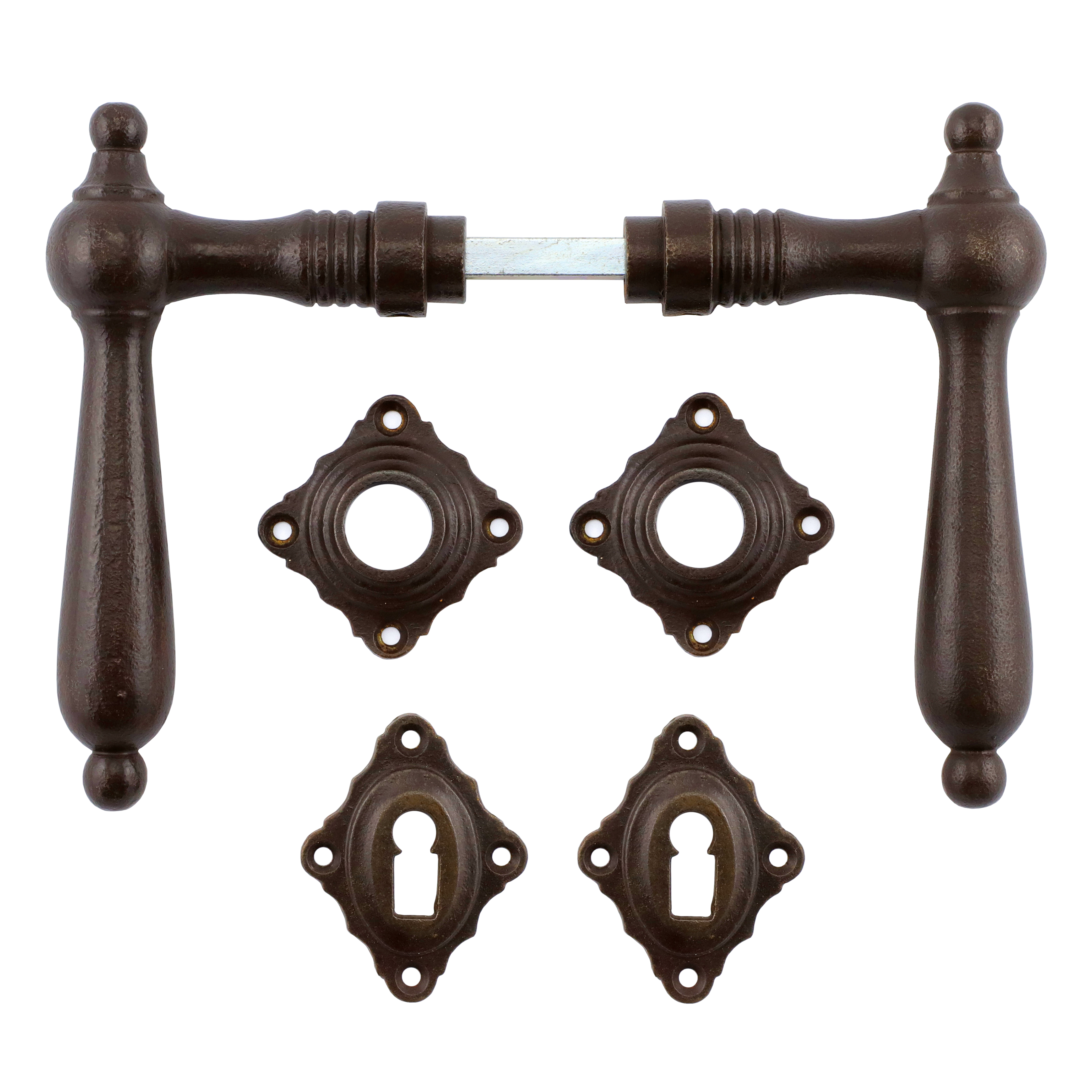Antikisierter Türbeschlag aus Eisen für Zimmertüren, mit massiven Griffen und Buntbart-Rosetten. Es handelt sich bei diesem rustikalen Türgriff um eine authentische Reproduktion nach historischem Vorbild.