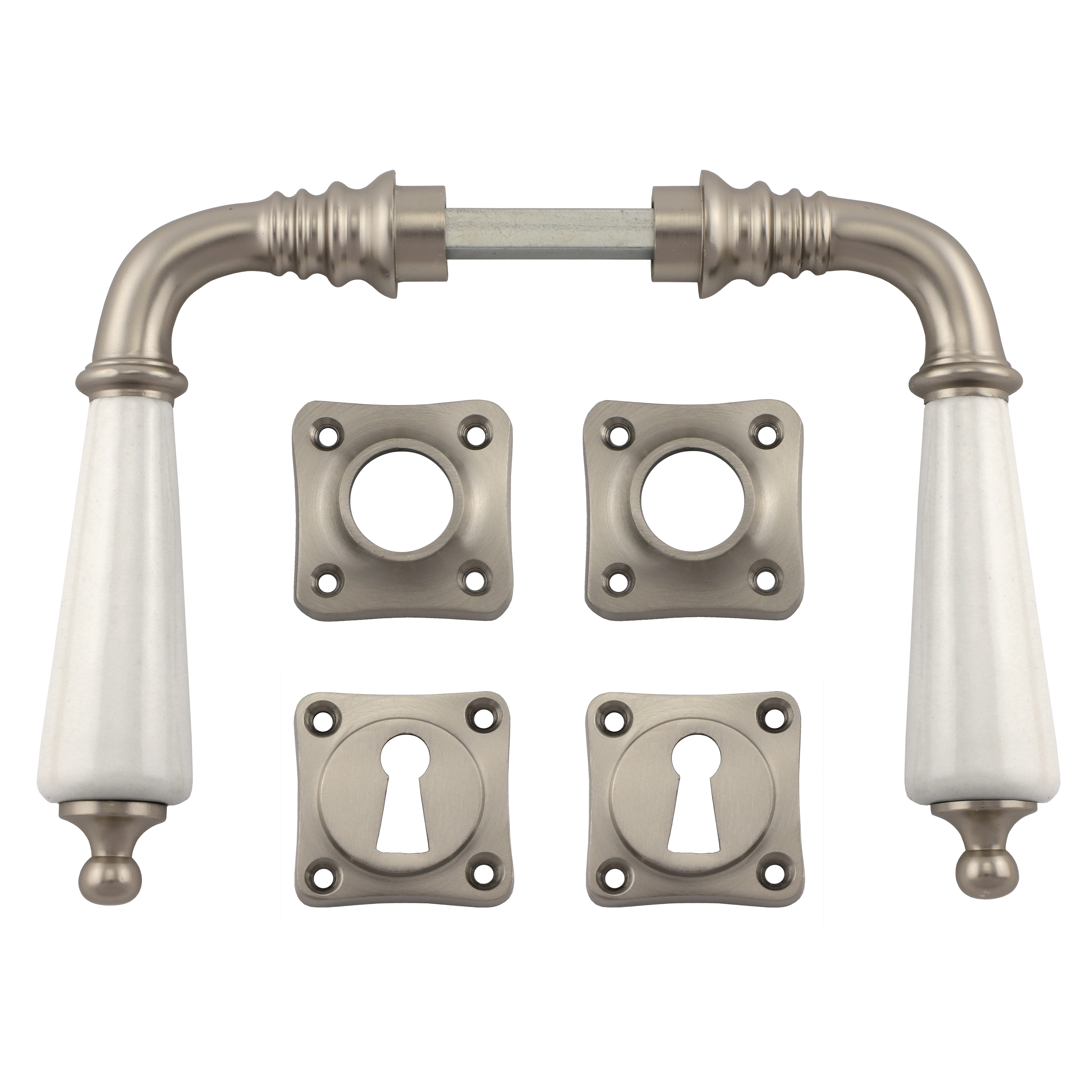 Vernickelter und mattierter Türbeschlag aus Messing für Zimmertüren, mit Porzellangriffen und Buntbart-Rosetten. Es handelt sich bei diesem eleganten Türgriff um eine authentische Reproduktion nach historischem Vorbild.