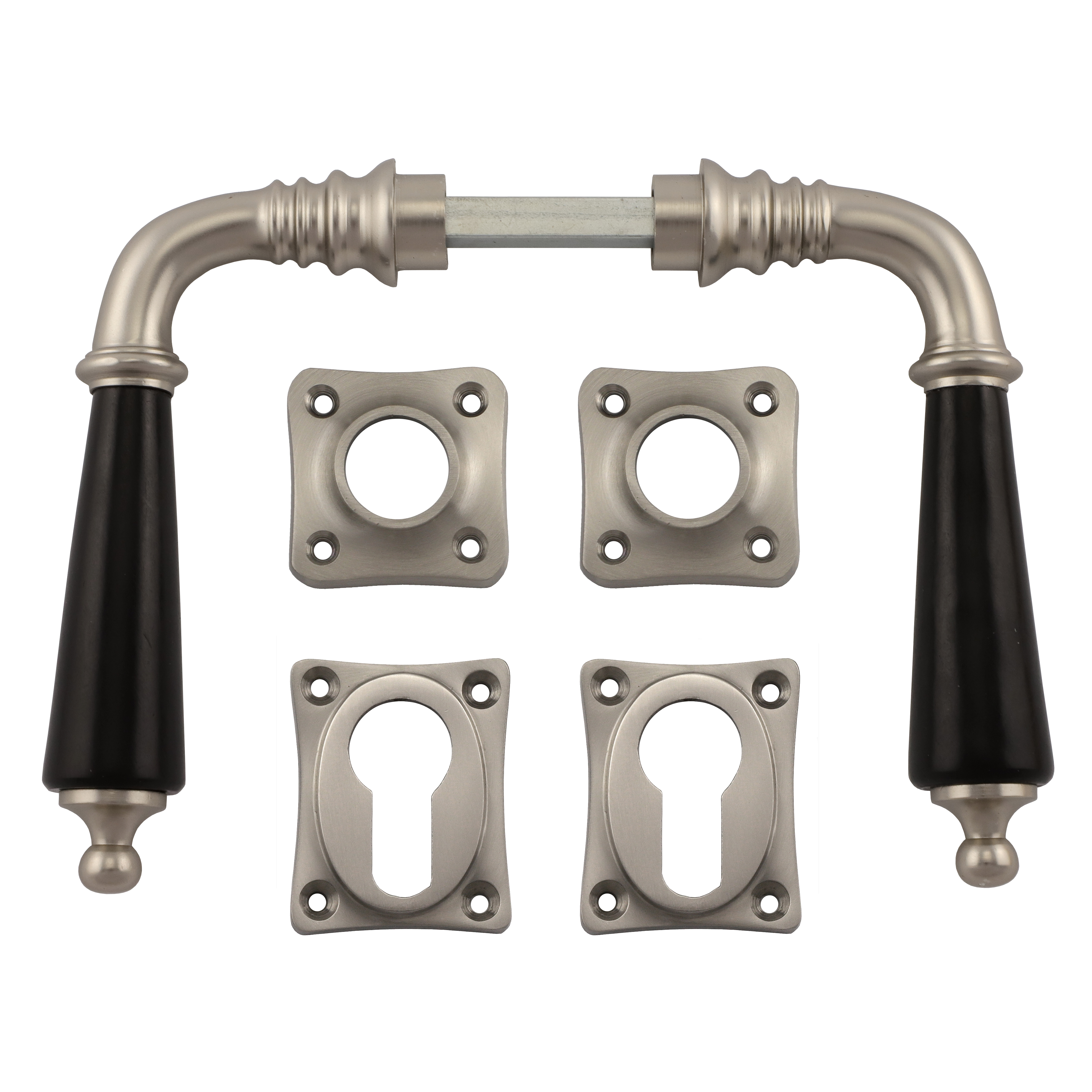 Vernickelter und matt gebürsteter Türbeschlag aus Messing für Zimmertüren, mit Ebenholz-Griffen und PZ-Rosetten. Es handelt sich bei diesem eleganten Türgriff um eine authentische Reproduktion nach historischem Vorbild.