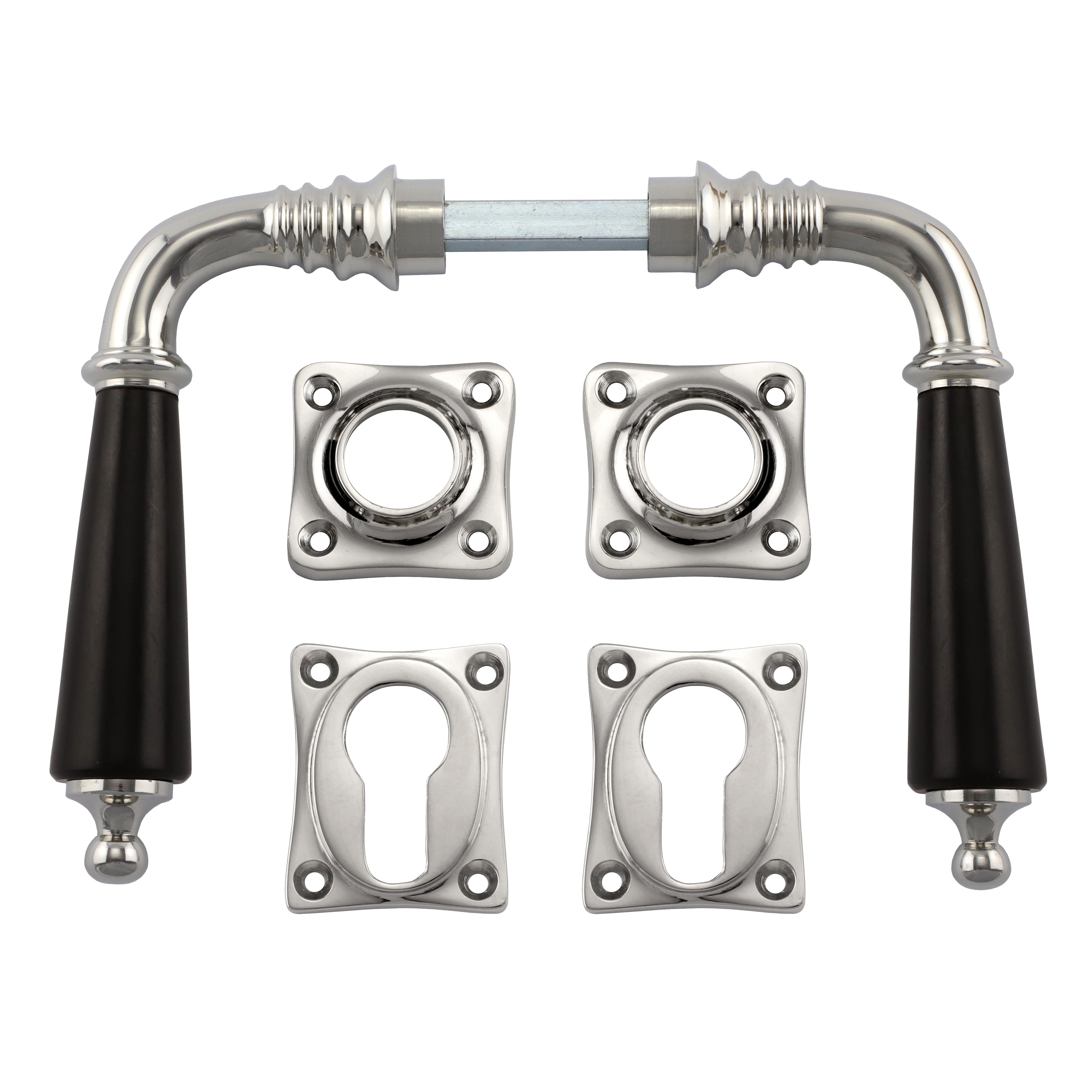 Vernickelter und polierter Türbeschlag aus Messing für Zimmertüren, mit Ebenholzgriffen und PZ-Rosetten. Es handelt sich bei diesem eleganten Türgriff um eine authentische Reproduktion nach historischem Vorbild.