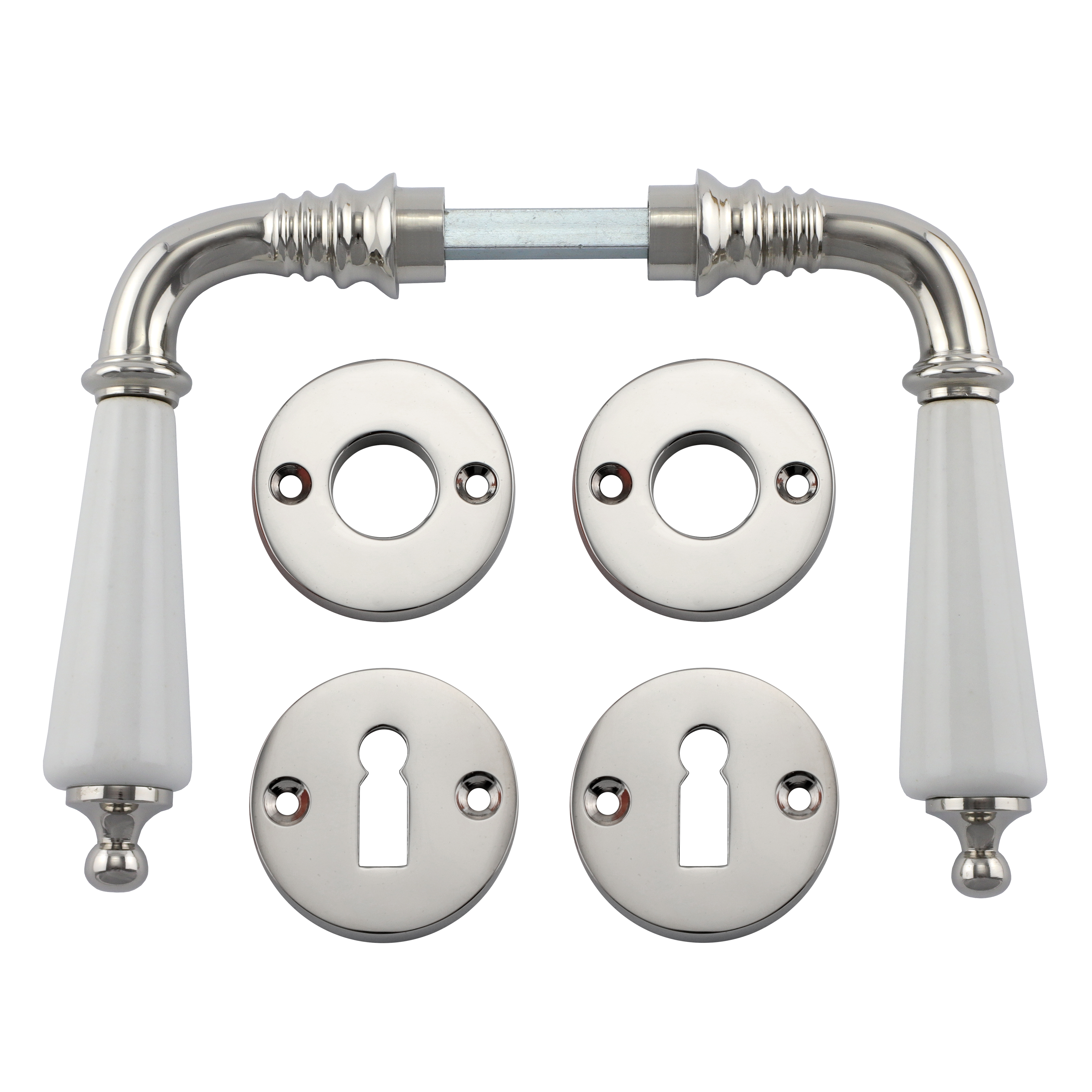 Vernickelter und polierter Türbeschlag aus Messing für Zimmertüren, mit Porzellangriffen und Buntbart-Rosetten. Es handelt sich bei diesem eleganten Türgriff um eine authentische Reproduktion nach historischem Vorbild.