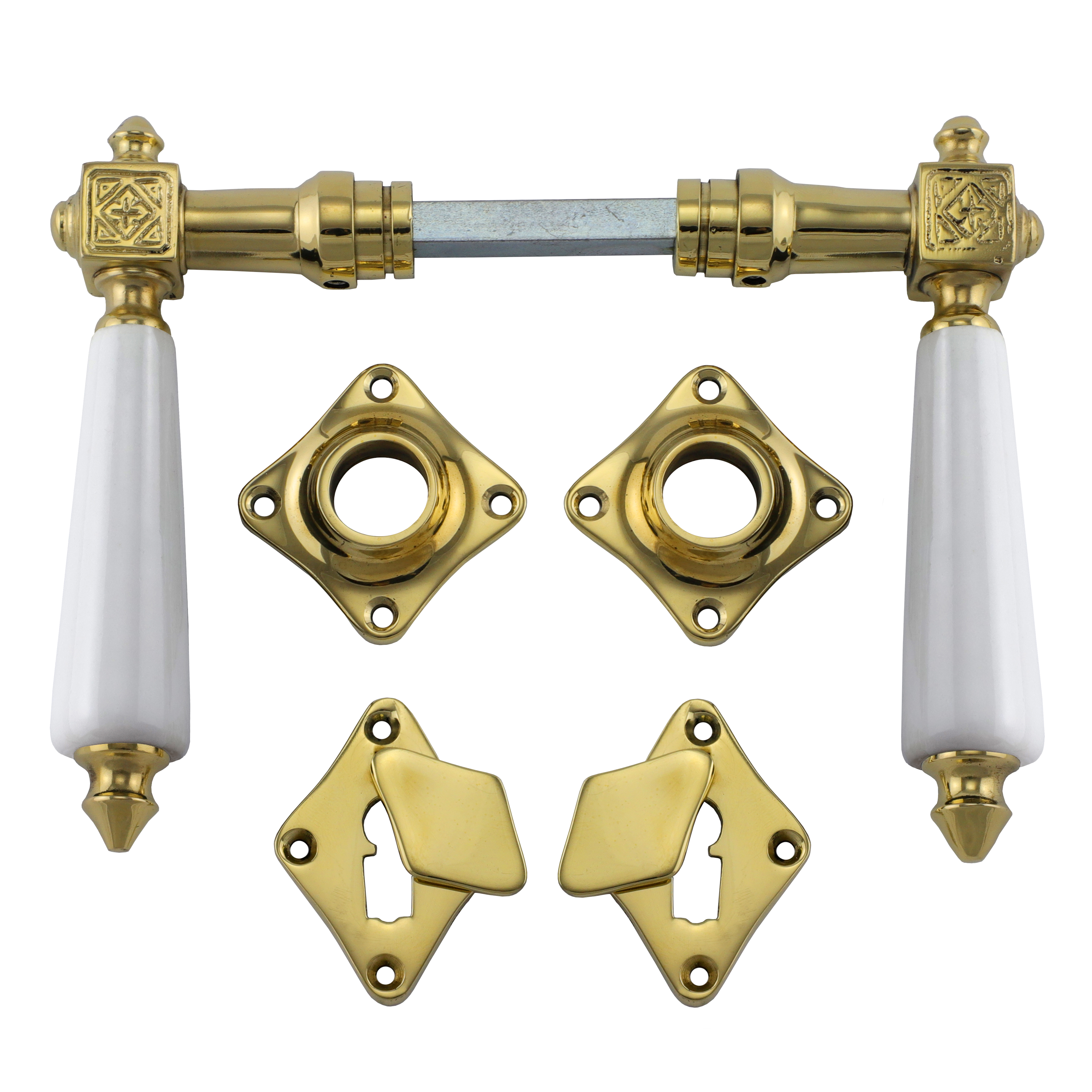 Eigenschaften "321.0138.35 Türgriffe mit Rosetten Messing poliert Porzellan Gründerzeit Kopie"