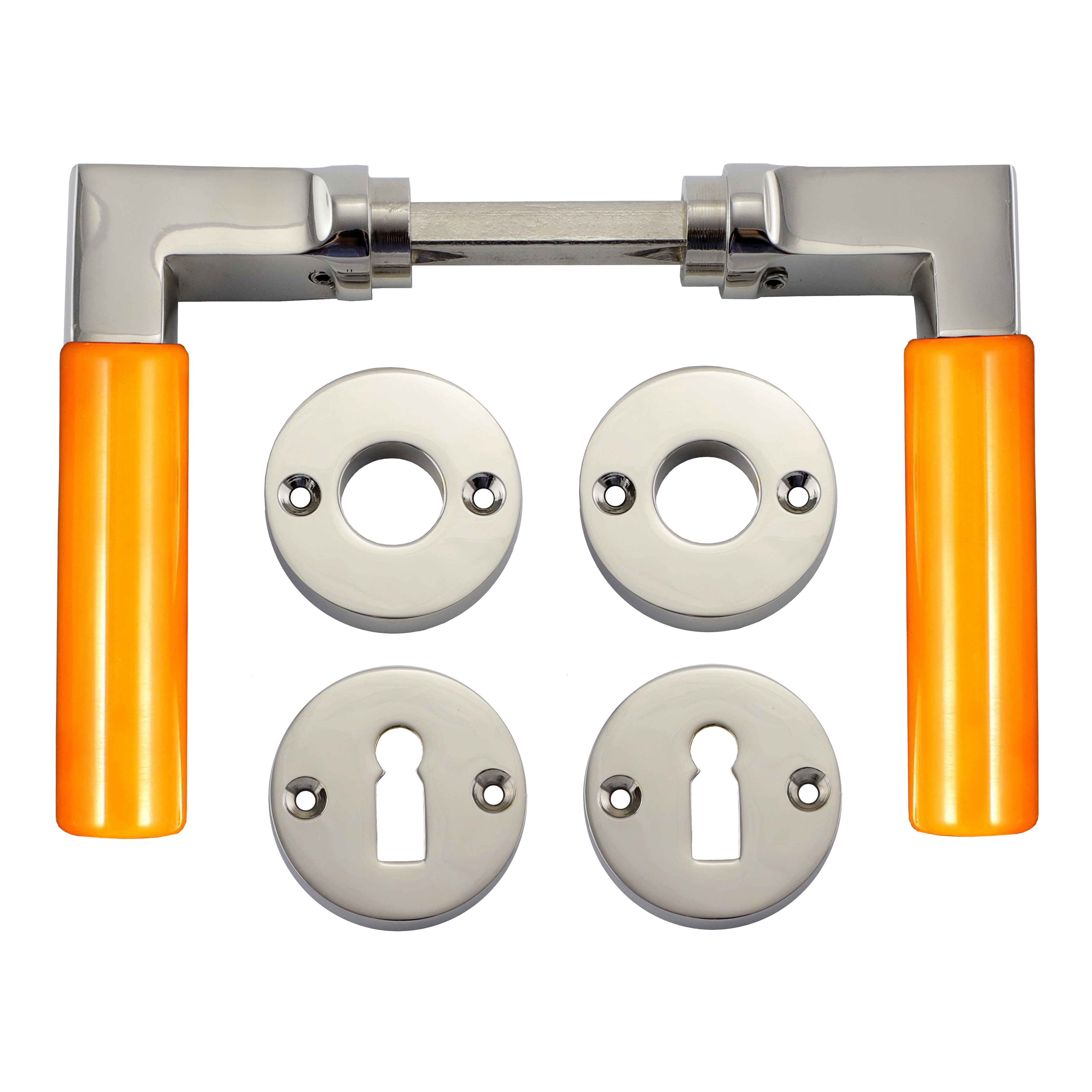 Vernickelter und polierter Türbeschlag aus Messing für Zimmertüren, mit orangenen Kunststoffgriffen und Buntbart-Rosetten. Es handelt sich bei diesem eleganten Türgriff um eine authentische Reproduktion nach historischem Vorbild.