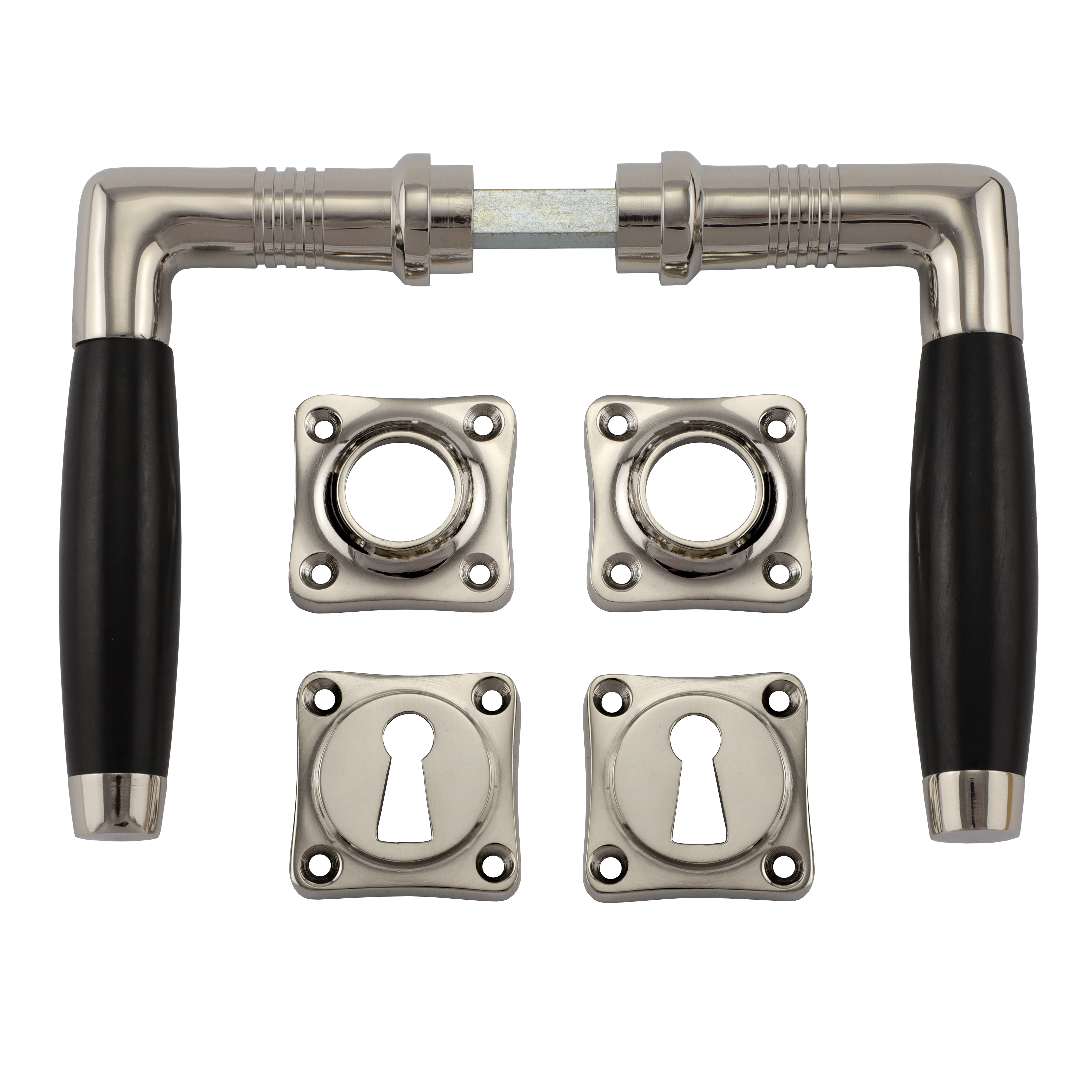 Vernickelter und polierter Türbeschlag aus Messing für Zimmertüren, mit Ebenholzgriffen und Buntbart-Rosetten. Es handelt sich bei diesem eleganten Türgriff um eine authentische Reproduktion nach historischem Vorbild.