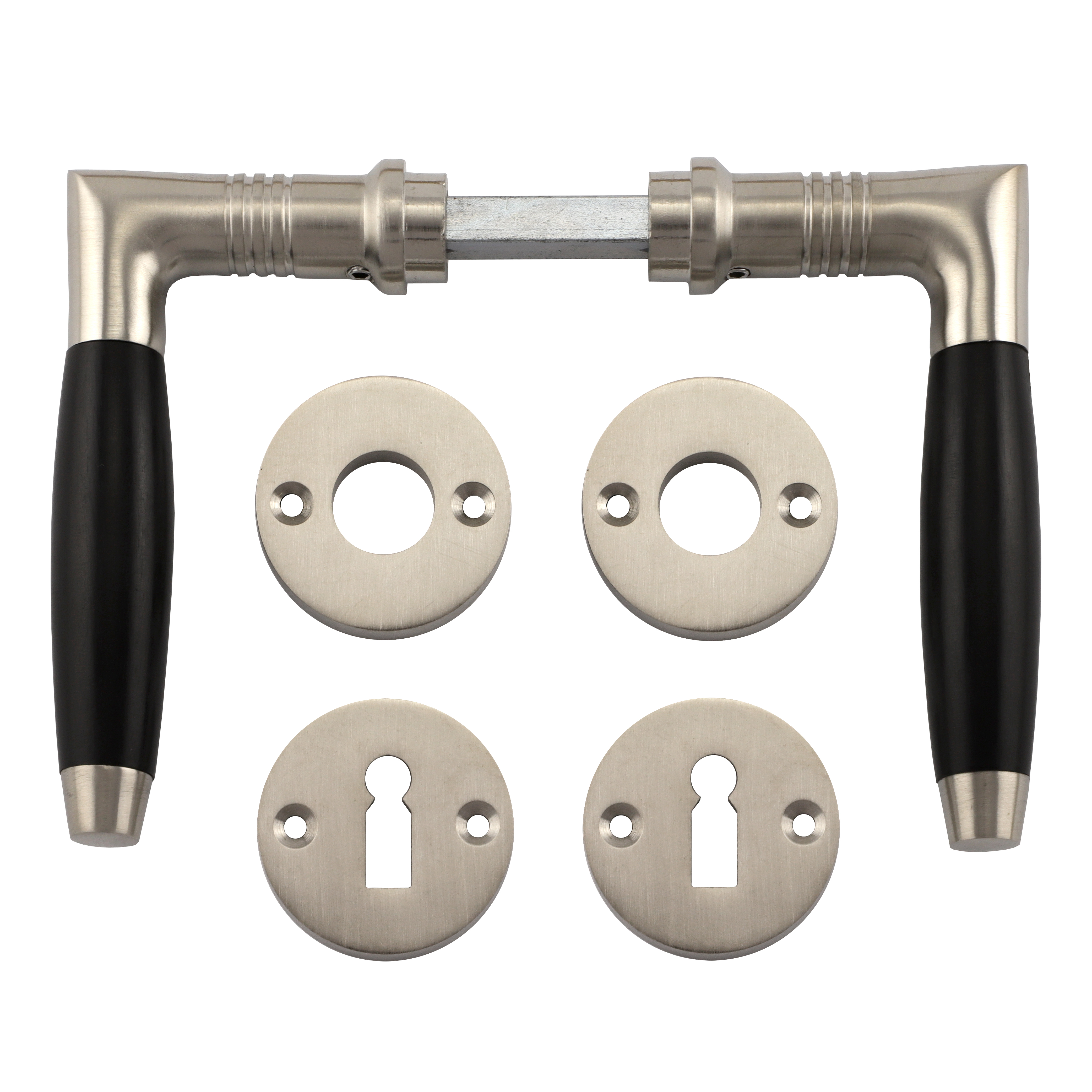 Vernickelter und mattierter Türbeschlag aus Messing für Zimmertüren, mit Ebenholzgriffen und Buntbart-Rosetten. Es handelt sich bei diesem eleganten Türgriff um eine authentische Reproduktion nach historischem Vorbild.