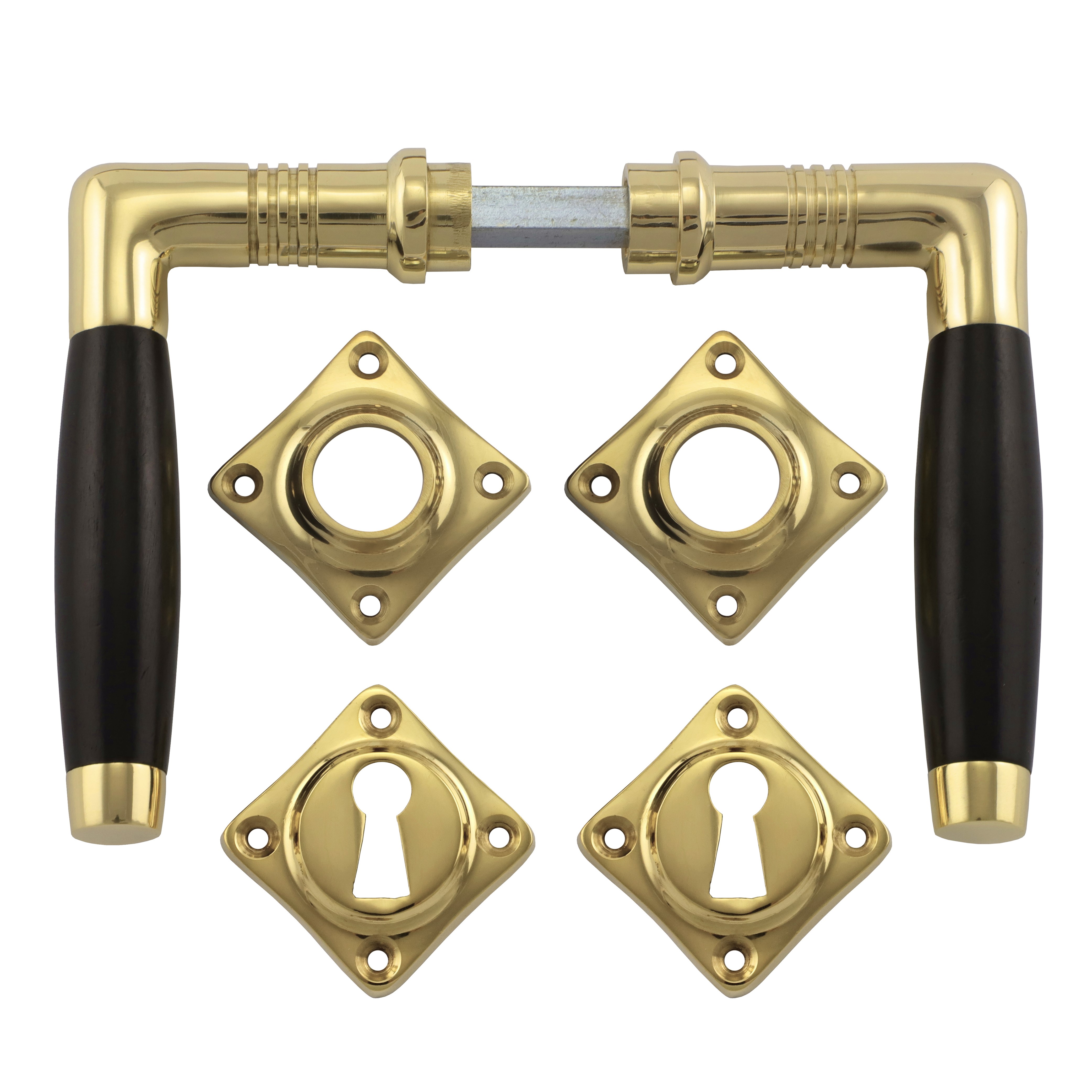 Polierter Türbeschlag aus Messing für Zimmertüren, mit Ebenholzgriffen und Buntbart-Rosetten. Es handelt sich bei diesem eleganten Türgriff um eine authentische Reproduktion nach historischem Vorbild.