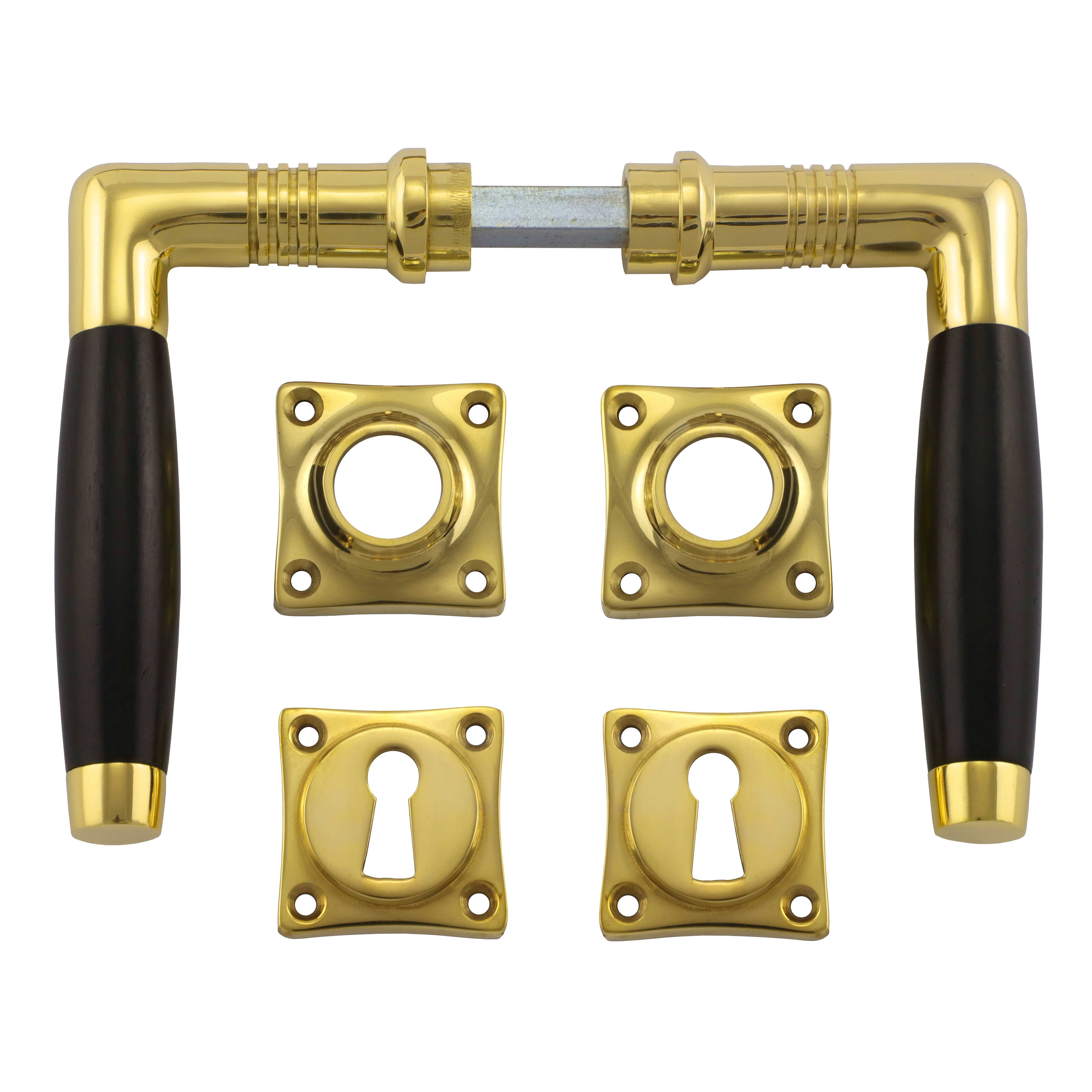 Polierter Türbeschlag aus Messing für Zimmertüren, mit Ebenholzgriffen und Buntbart-Rosetten. Es handelt sich bei diesem eleganten Türgriff um eine authentische Reproduktion nach historischem Vorbild.