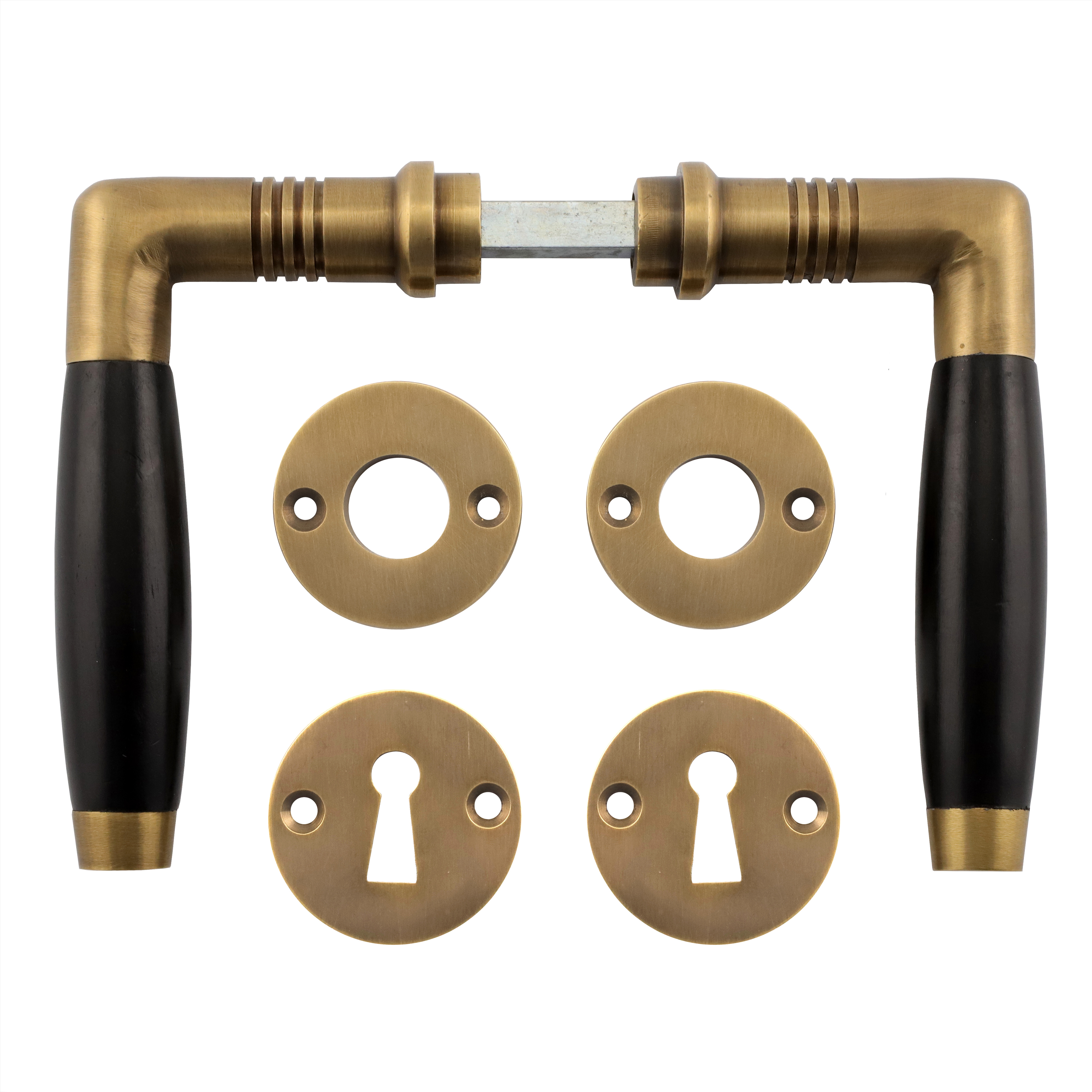 Patinierter Türbeschlag aus Messing für Zimmertüren, mit Ebenholzgriffen und Buntbart-Rosetten. Es handelt sich bei diesem eleganten Türgriff um eine authentische Reproduktion nach historischem Vorbild.