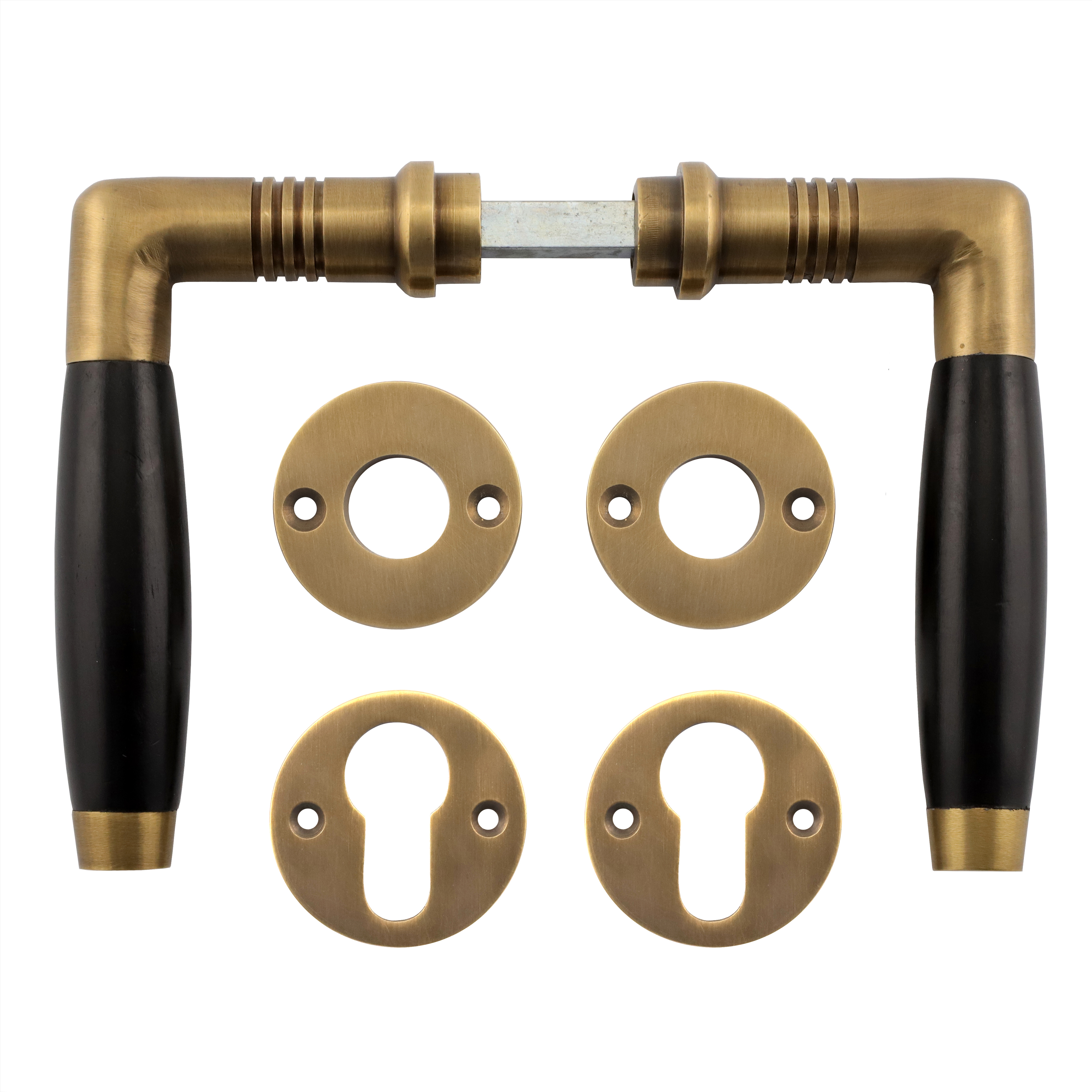 Patinierter Türbeschlag aus Messing für Zimmertüren, mit Ebenholzgriffen und PZ-Rosetten. Es handelt sich bei diesem eleganten Türgriff um eine authentische Reproduktion nach historischem Vorbild.