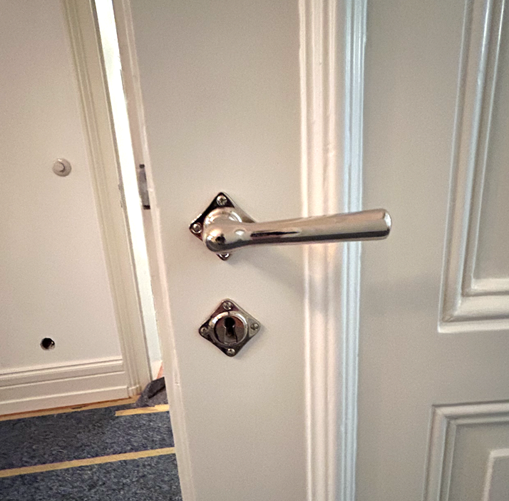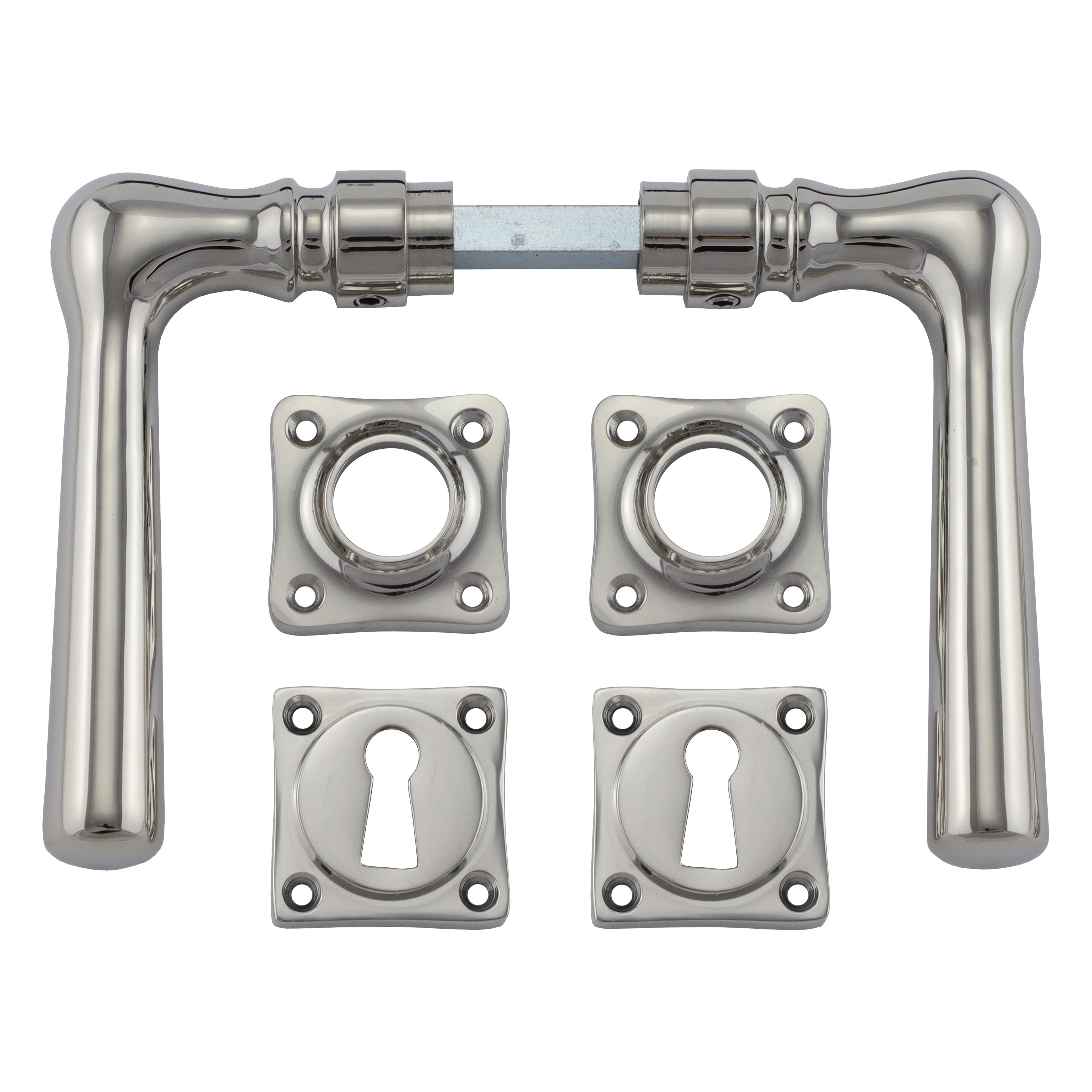 Vernickelter und polierter Türbeschlag aus Messing für Zimmertüren, mit massiven Griffen und Buntbart-Rosetten. Es handelt sich bei diesem eleganten Türgriff um eine authentische Reproduktion nach historischem Vorbild.