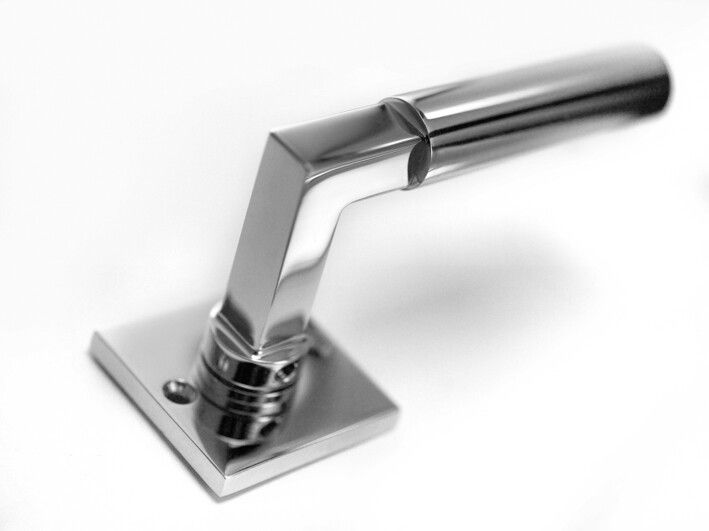 Vernickelter und polierter Türbeschlag aus Messing für Zimmertüren, mit massiven Griffen und PZ-Rosetten. Es handelt sich bei diesem eleganten Türgriff um eine authentische Reproduktion nach historischem Vorbild.