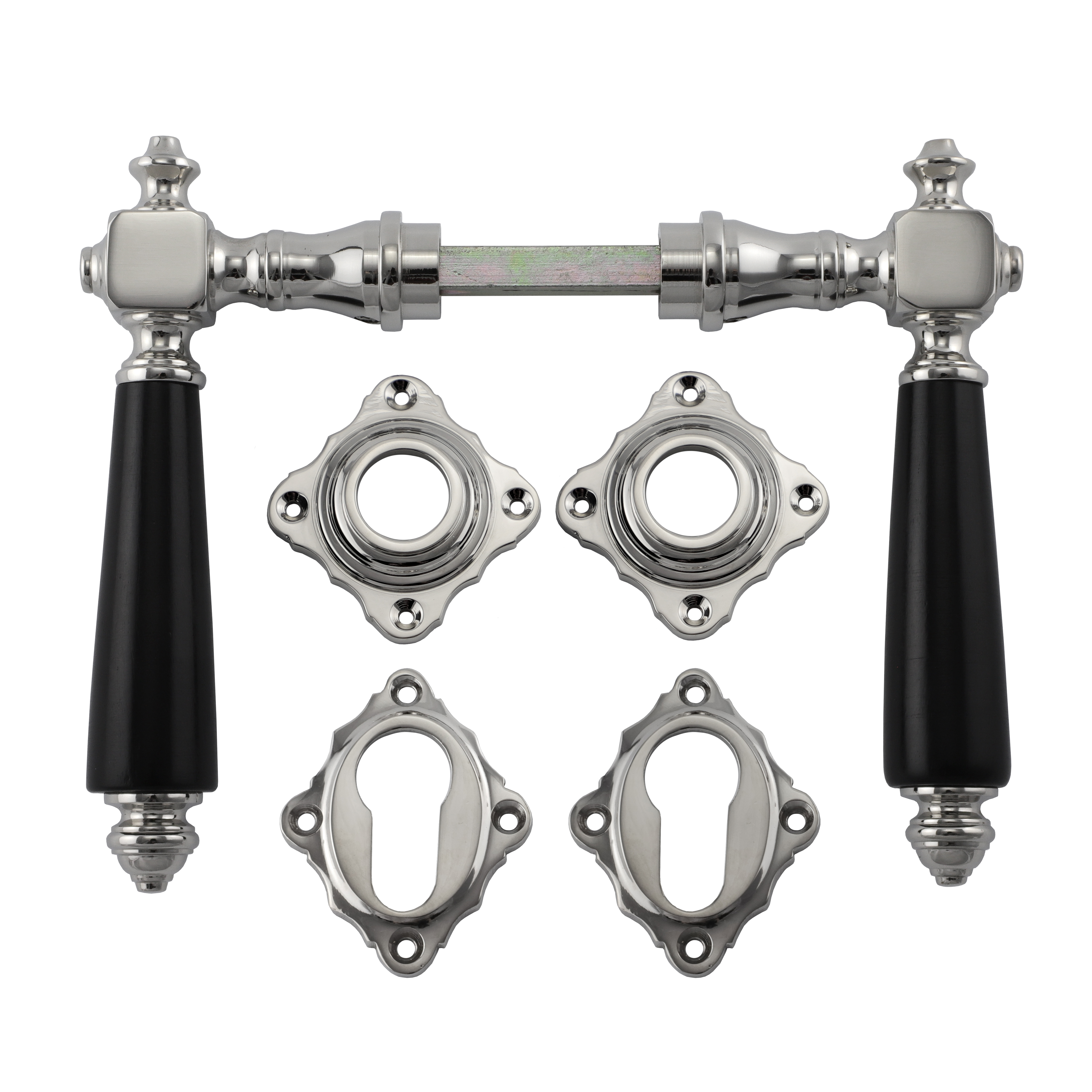 321.0193.10 Frankfurter Türgriffe mit PZ-Rosetten Nickel poliert Ebenholz Historismus