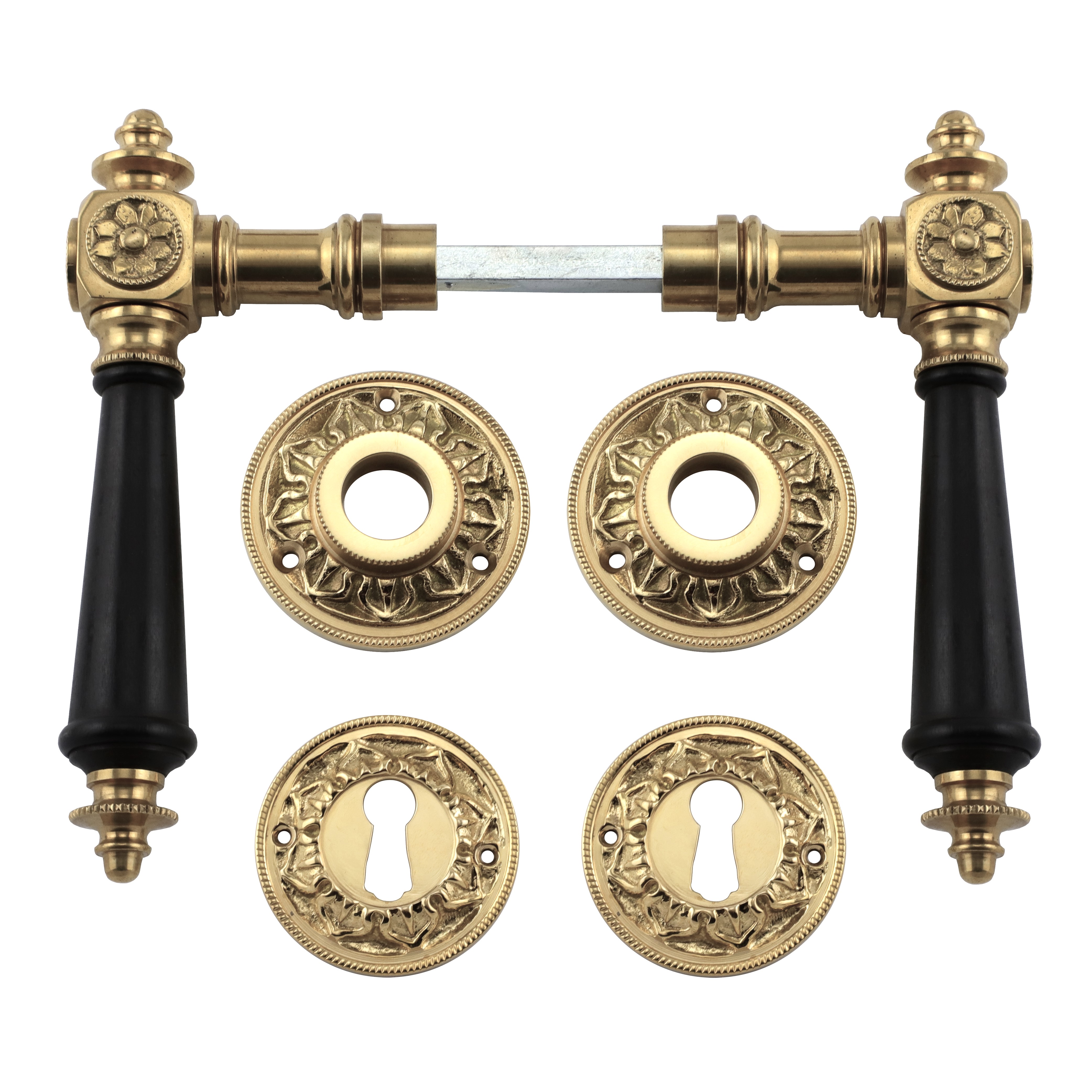 Polierter Türbeschlag aus Messing für Zimmertüren, mit schwarzen Ebenholzgriffen und Buntbart-Rosetten. Es handelt sich bei diesem eleganten Türgriff um eine authentische Reproduktion nach historischem Vorbild.