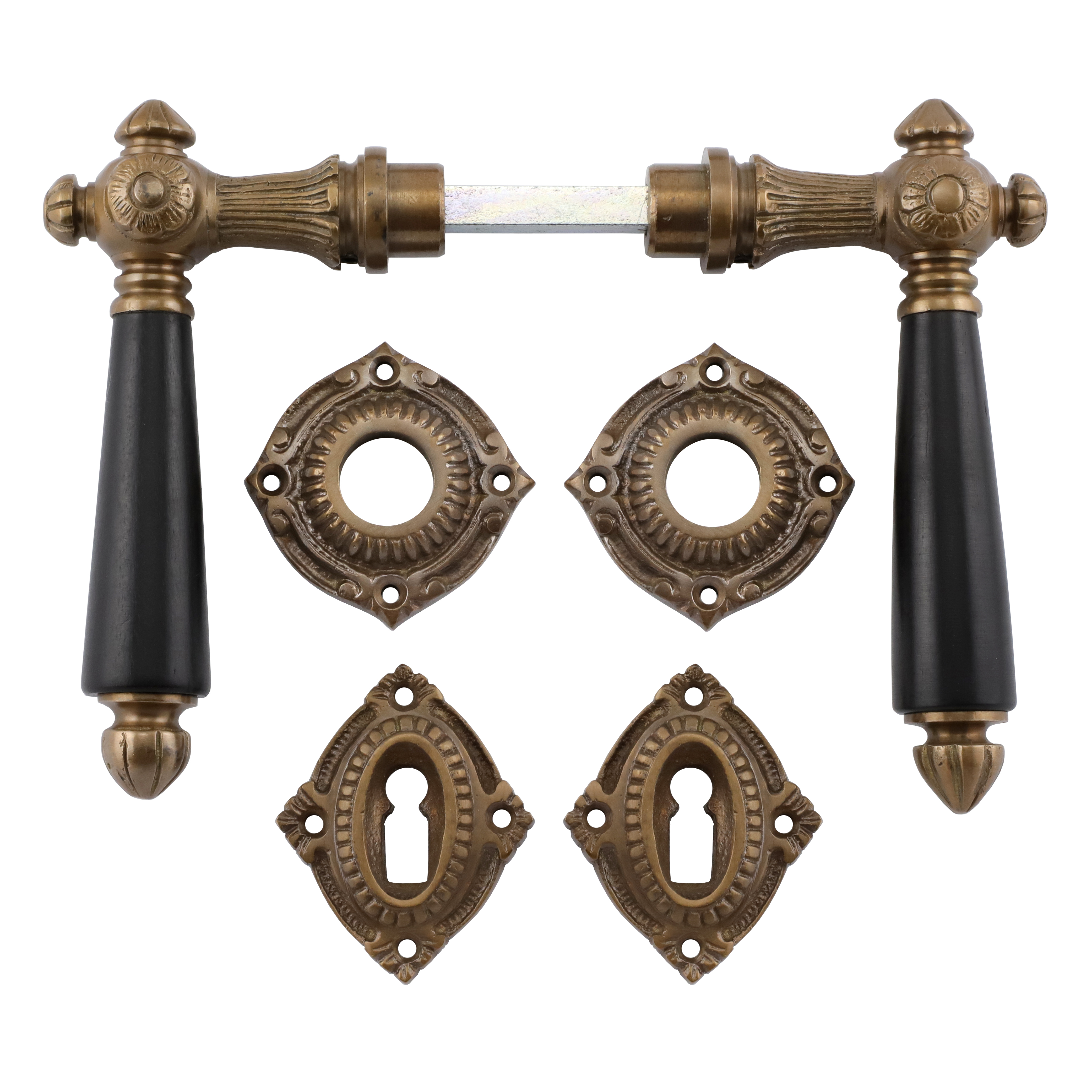 Patinierter Türbeschlag aus Messing für Zimmertüren, mit schwarzen Ebenholzgriffen und Buntbart-Rosetten. Es handelt sich bei diesem eleganten Türgriff um eine authentische Reproduktion nach historischem Vorbild.