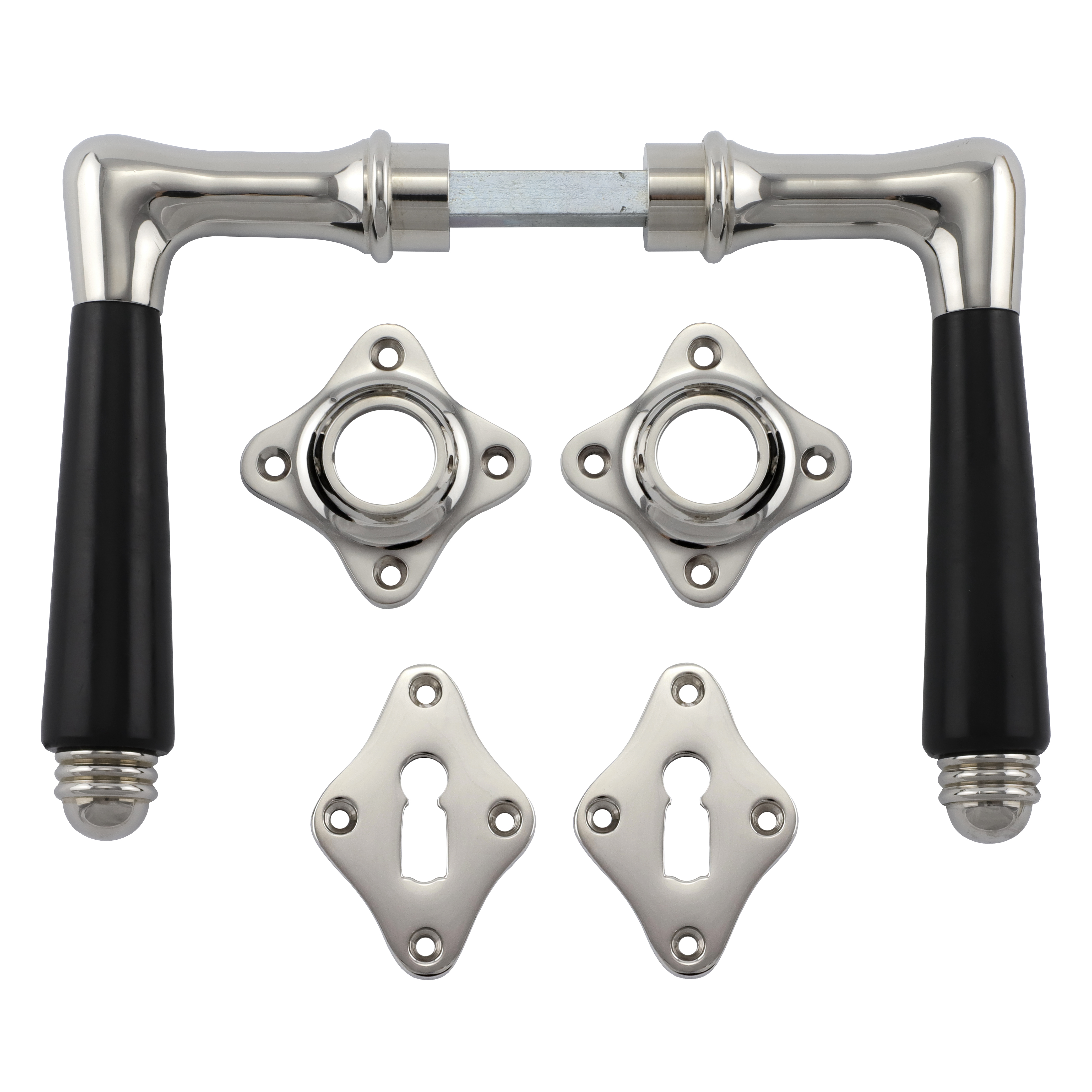 Vernickelter und polierter Türbeschlag aus Messing für Zimmertüren, mit Ebenholzgriffen und Buntbart-Rosetten. Es handelt sich bei diesem eleganten Türgriff um eine authentische Reproduktion nach historischem Vorbild.