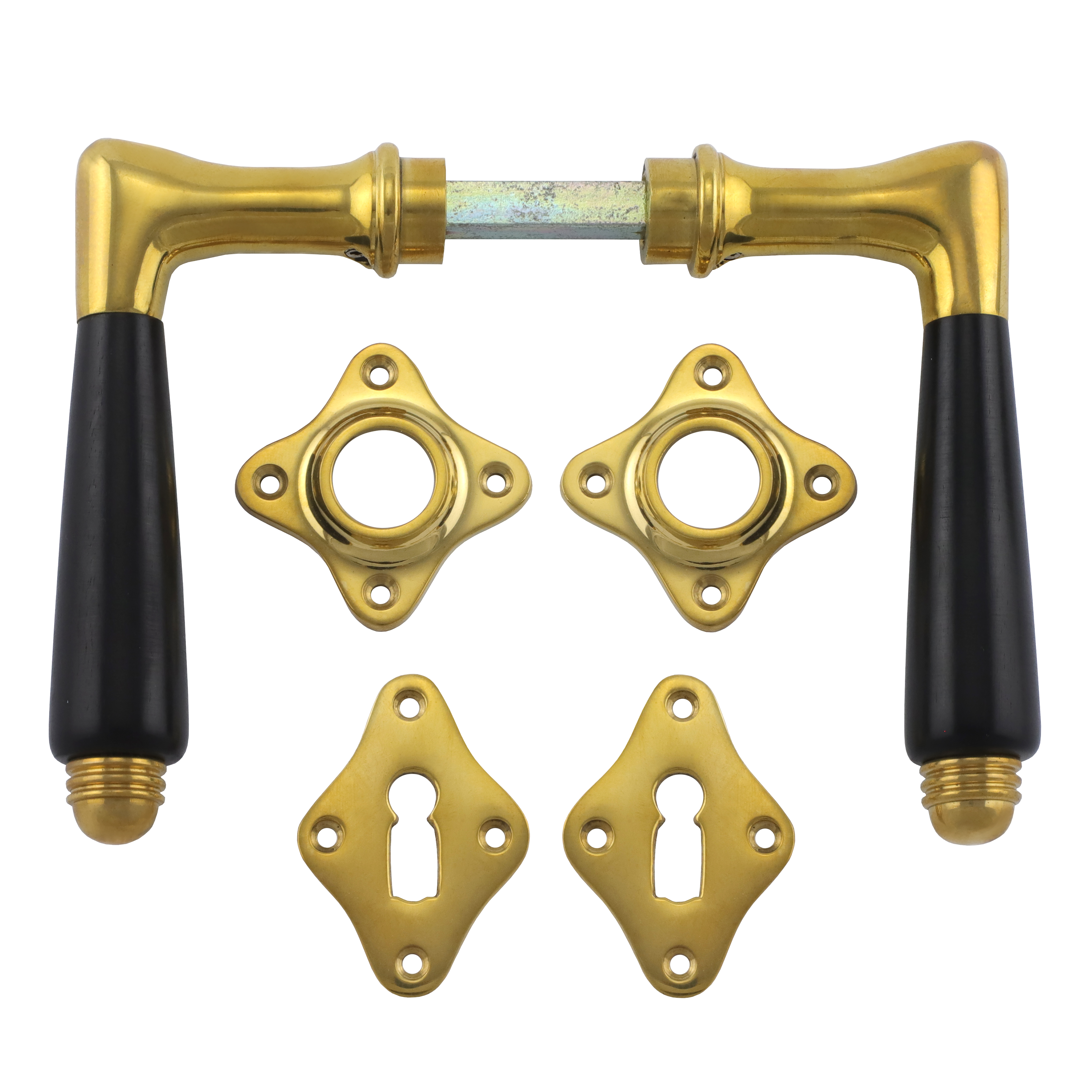 Polierter Türbeschlag aus Messing für Zimmertüren, mit Ebenholzgriffen und Buntbart-Rosetten. Es handelt sich bei diesem eleganten Türgriff um eine authentische Reproduktion nach historischem Vorbild.