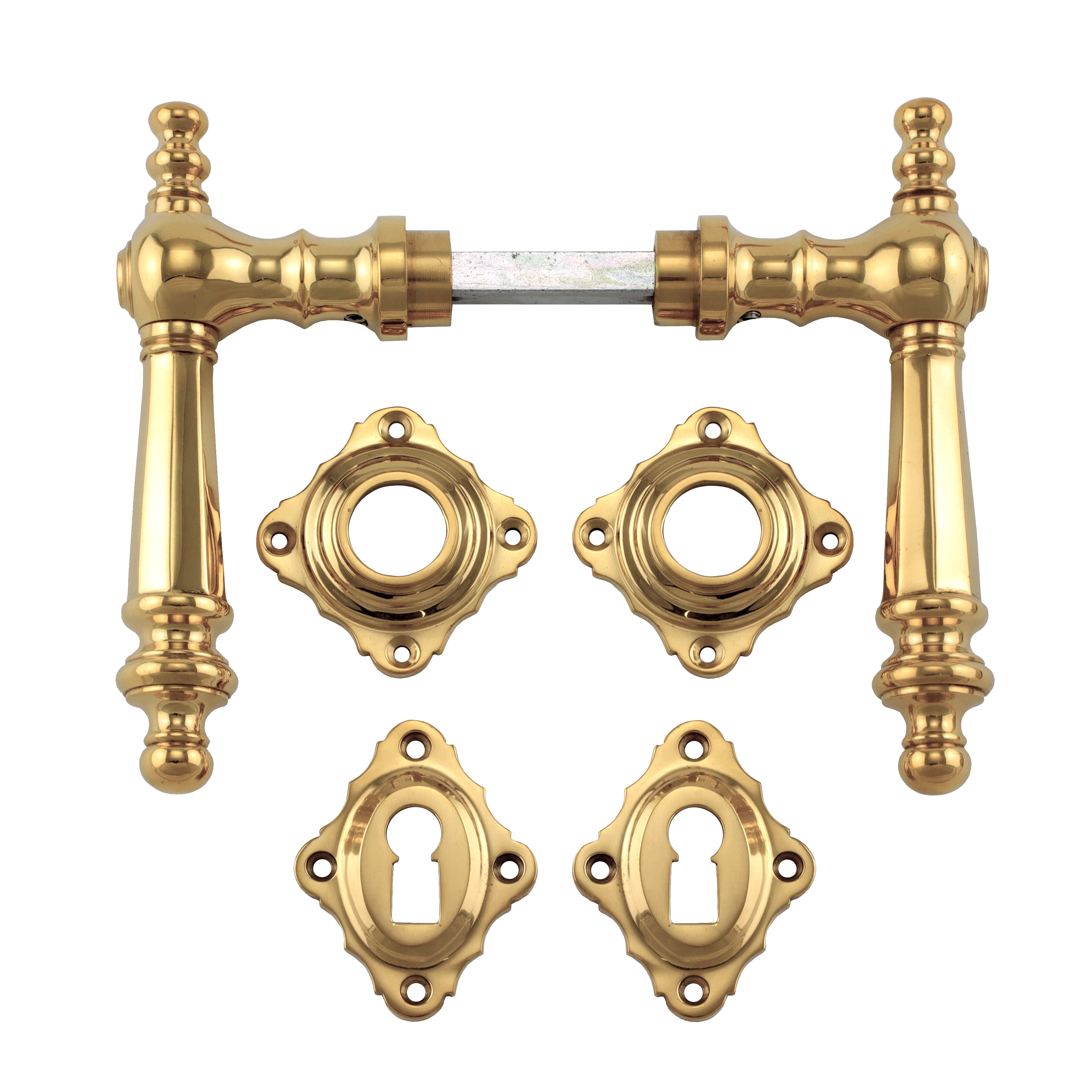 Polierter Türbeschlag aus Messing für Zimmertüren, mit massiven Griffen und Buntbart-Rosetten. Es handelt sich bei diesem eleganten Türgriff um eine authentische Reproduktion nach historischem Vorbild.