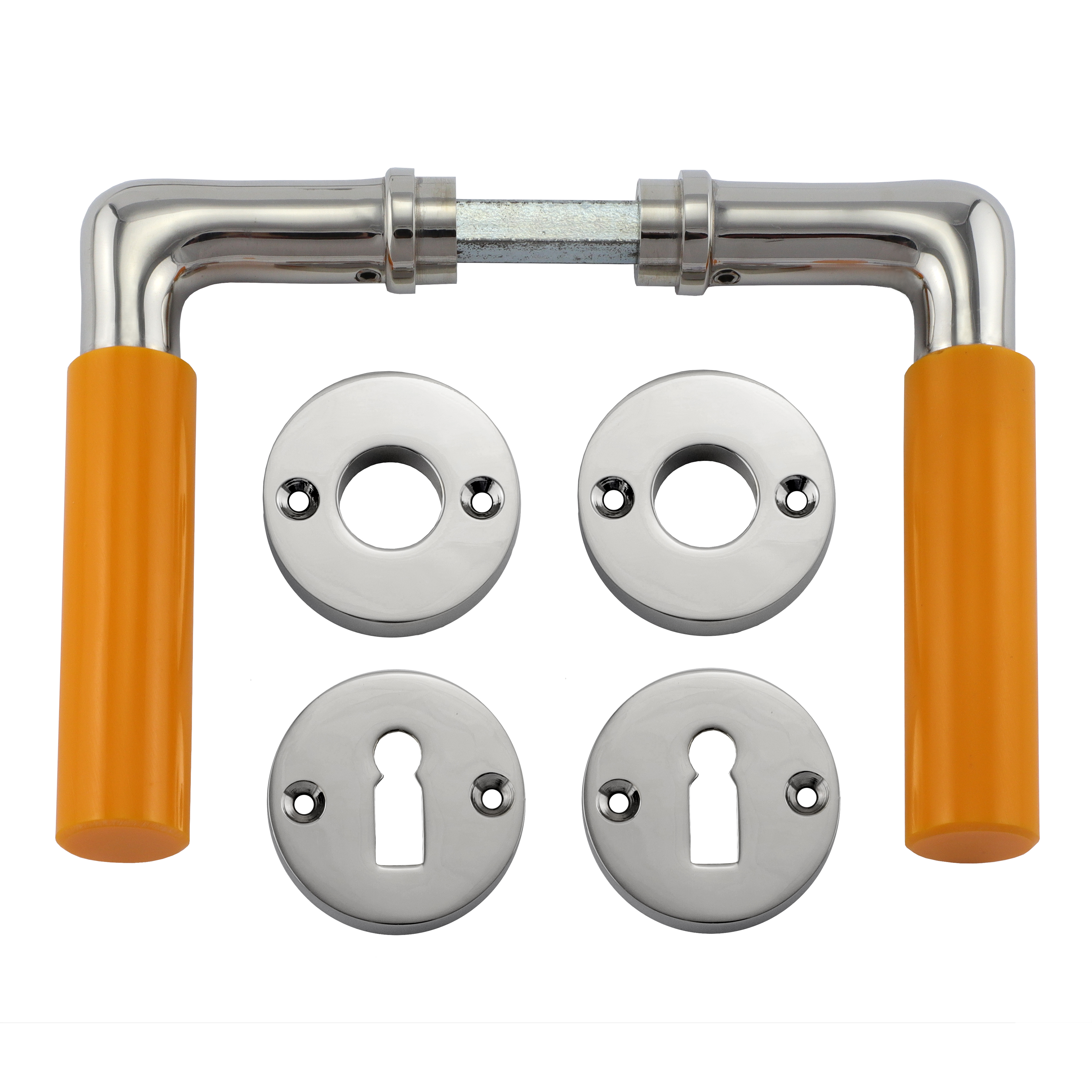 Vernickelter und polierter Türbeschlag aus Messing für Zimmertüren, mit orangenen Kunststoffgriffen und Buntbart-Rosetten. Es handelt sich bei diesem eleganten Türgriff um eine authentische Reproduktion nach historischem Vorbild.