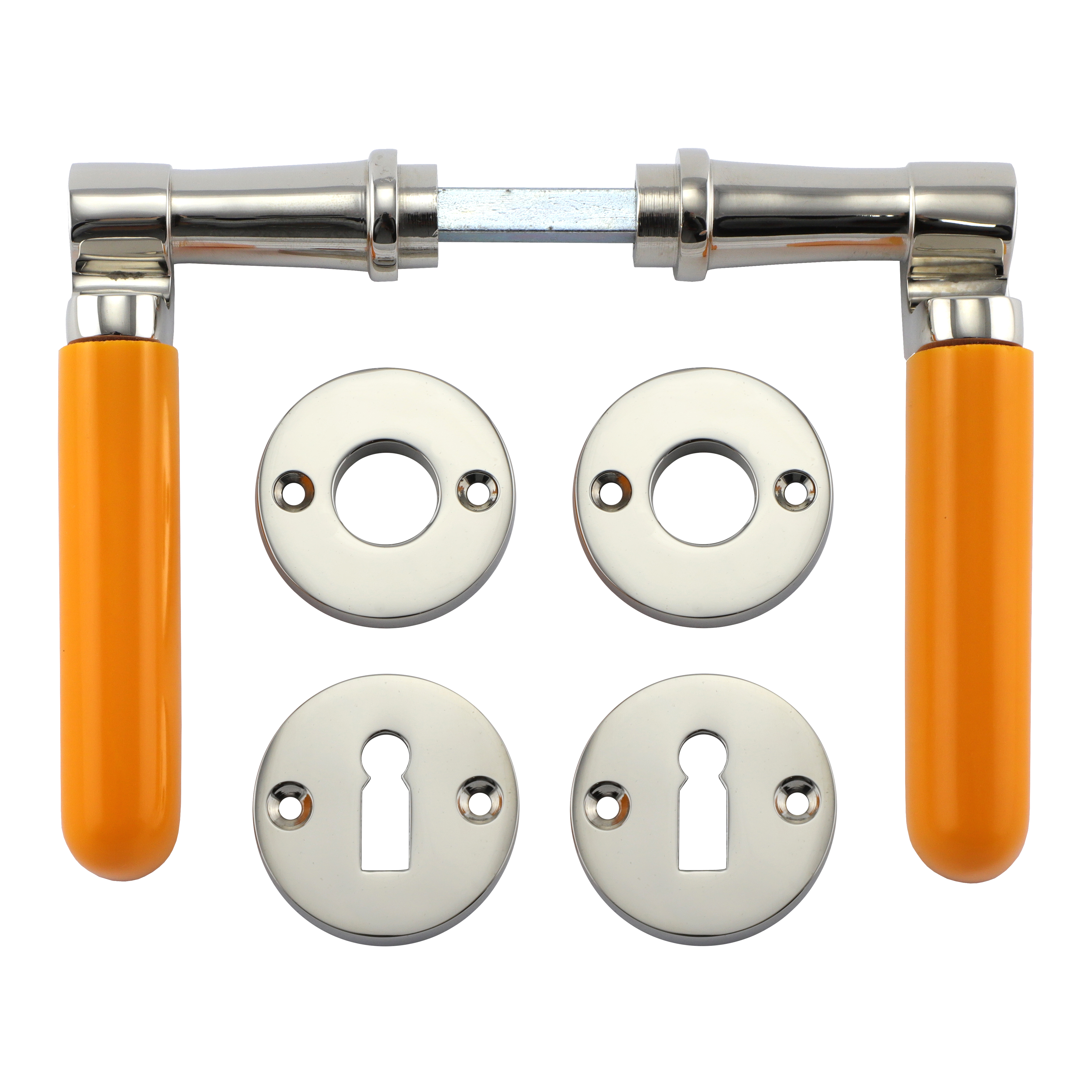 Vernickelter und polierter Türbeschlag aus Messing für Zimmertüren, mit orangenen Kunststoffgriffen und Buntbart-Rosetten. Es handelt sich bei diesem eleganten Türgriff um eine authentische Reproduktion nach historischem Vorbild.